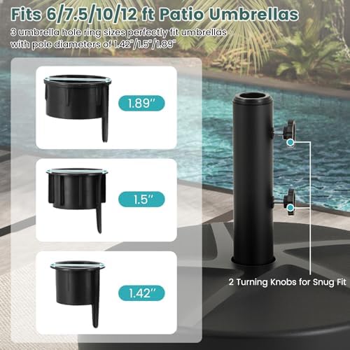 - [Universal Compatibility]: Designed for versatility, this umbrella stand includes three adapter rings to accommodate umbrella poles with diameters of 1.89', 1.5', and 1.42'. Additionally, two adjustable tightening knobs ensure a firm and stable hold, making it compatible with most 6-10 ft patio umbrellas.