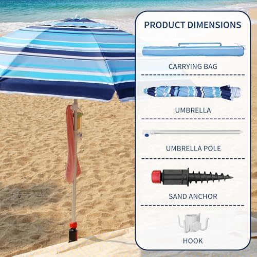 7ft Heavy Duty High Wind Beach Umbrella Parasols with sand anchor & Tilt Sun Shelter, UV 50+ Protection Outdoor Sunshade Umbrellas Carry Bag for Patio Garden Pool Backyard Stripe Blue