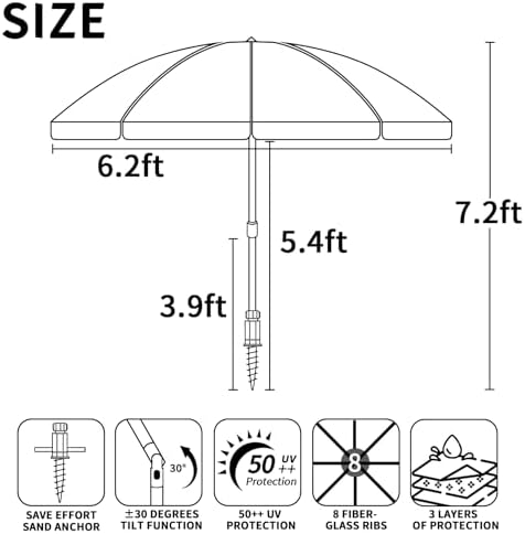 - ☂ WITH REMOVABLE SAND ANCHOR: The 7ft beach umbrella with a portable and reinforced sand anchor that can help you twist your beach umbrella into the sand or dirt more easily and stronger. After removing the anchor can also be used in the garden,patio,pool.