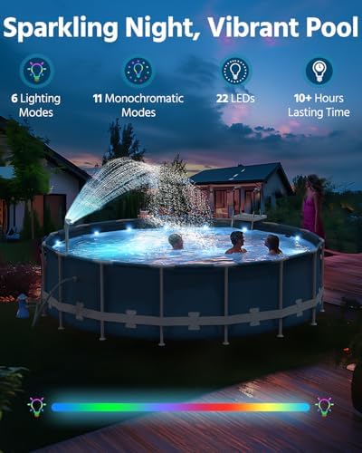 - Smart LED Lighting & Multi-Mode Control – With 22 upgraded LEDs, 6 vibrant colors, and 11 dynamic lighting modes, this fountain lights up your pool for unforgettable nights. Easily customize the mood via RF remote or app. Powered by the sun with USB-C backup charging—ensuring a brilliant display day or night, rain or shine.