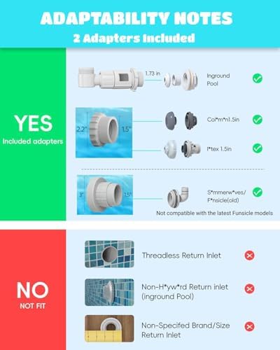 - Universal Compatibility – Equipped with a 1.5' standard threaded connector, Our pool waterfall fits most in-ground pool return jets. Bonus 2.2' male inlet fitting for 1.5'/1.25' above-ground pool hoses and 3' threaded fittings compatible with most Summer Waves, Funsicle, and similar pools (excluding latest Funsicle models). For best results and a stronger fountain effect, use with a 0.2 HP or higher filter pump.