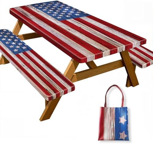 Picnic Table Cover with Bench Covers American Flag Waterproof Windproof Fitted Outdoor Tablecloth with Elastic Rectangle Table Cloth Camping Accessories,72x30 Inch