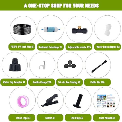 - Easy to install: Comes with detailed instructions and enough accessories (75FT 1/4 inch pipe, 1 pcs purifier, 1 pcs U.S.gauge water hose adapter, 24 pcs brass sprayer nozzle, 24 pcs zip ties, 2 pcs plumbing fittings, 4 pcs 1/4 plugs, 1 pcs cutting knife, 24 pcs saddle nails, 1 pcs raw straps, 2pcs 4/1 slim tee tubing)