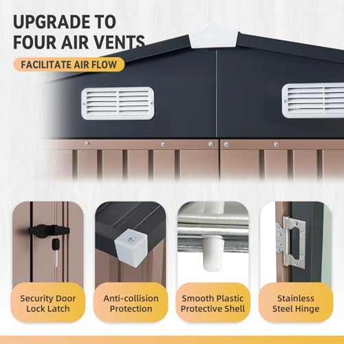 - Dual-Door Accessibility & Smart Ventilation Design: Features double front doors for effortless storage of bulky items like bicycles or lawn mowers. The integrated top ventilation vents regulate airflow to prevent condensation, keeping tools rust-free. Stainless steel latch locks and reinforced hinges provide security against theft and animal intrusion
