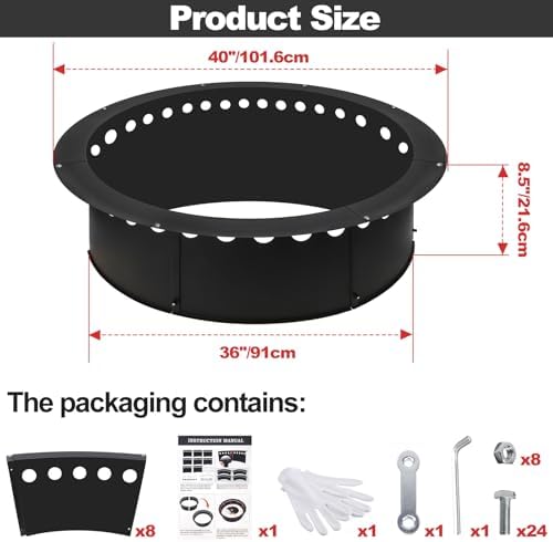 - Spacious & Portable: With a 36″ inner diameter, 40″ outer diameter, and 8.5″ height, the round large fire pit ring offers ample space for more wood and longer burn times; its eight removable panels break down flat for easy transport and storage
