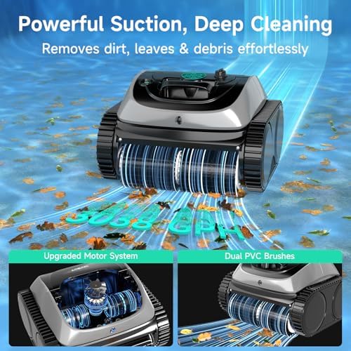 - Powerful Suction & Deep Cleaning: Equipped with an upgraded independent water pump motor, WYBOT C1 pool vacuum delivers 2X stronger suction to lift debris, sand, leaves, and algae. Dual PVC brushes grip surfaces tightly, working on tile/mosaic/glass. Smartly avoids stuck scenarios for uninterrupted cleaning
