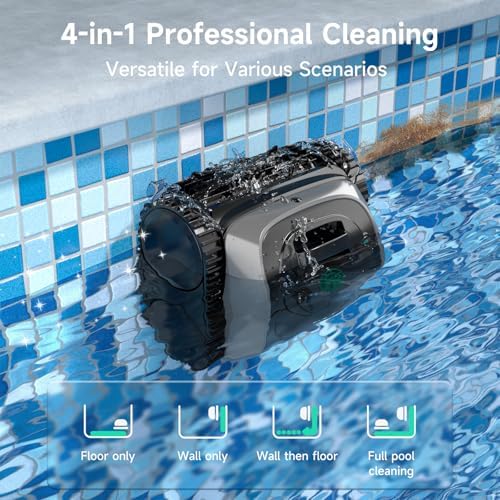 - 4-in-1 Automatic Pool Master: Designed for inground swimming pools, this lightweight robot pool cleaner tackles floors, walls, waterlines & stairs effortlessly. Triple motors boost climbing power to handle 45° slopes, while enhanced obstacle avoidance navigates drains seamlessly