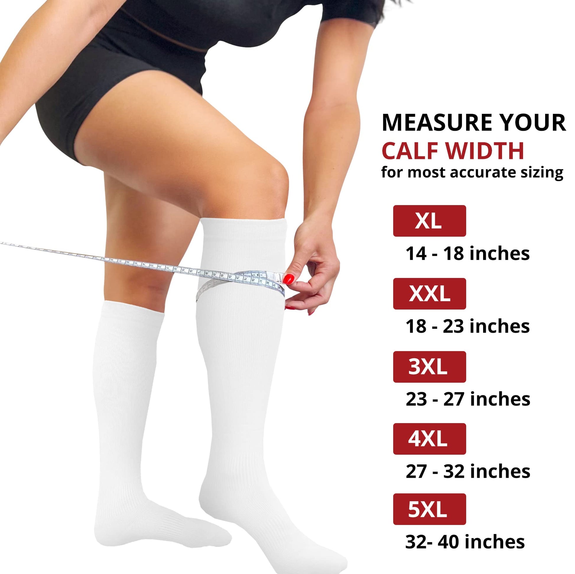 - Made for Plus Sizes: Our extra wide calf compression socks are designed for plus-size individuals and provide a comfortable and supportive fit for men and women with larger legs. We have the longest size range (from XL to XXXXXL) and fit up to a 40 inch extra wide calf.