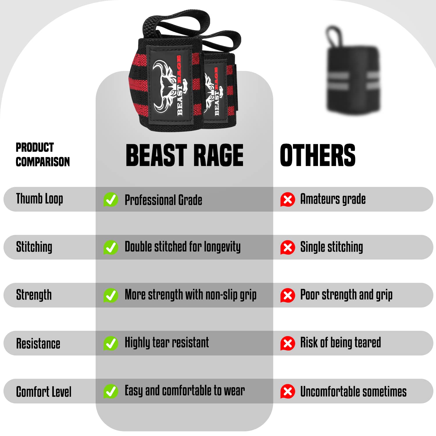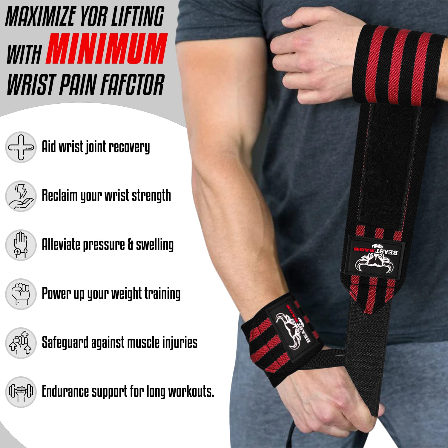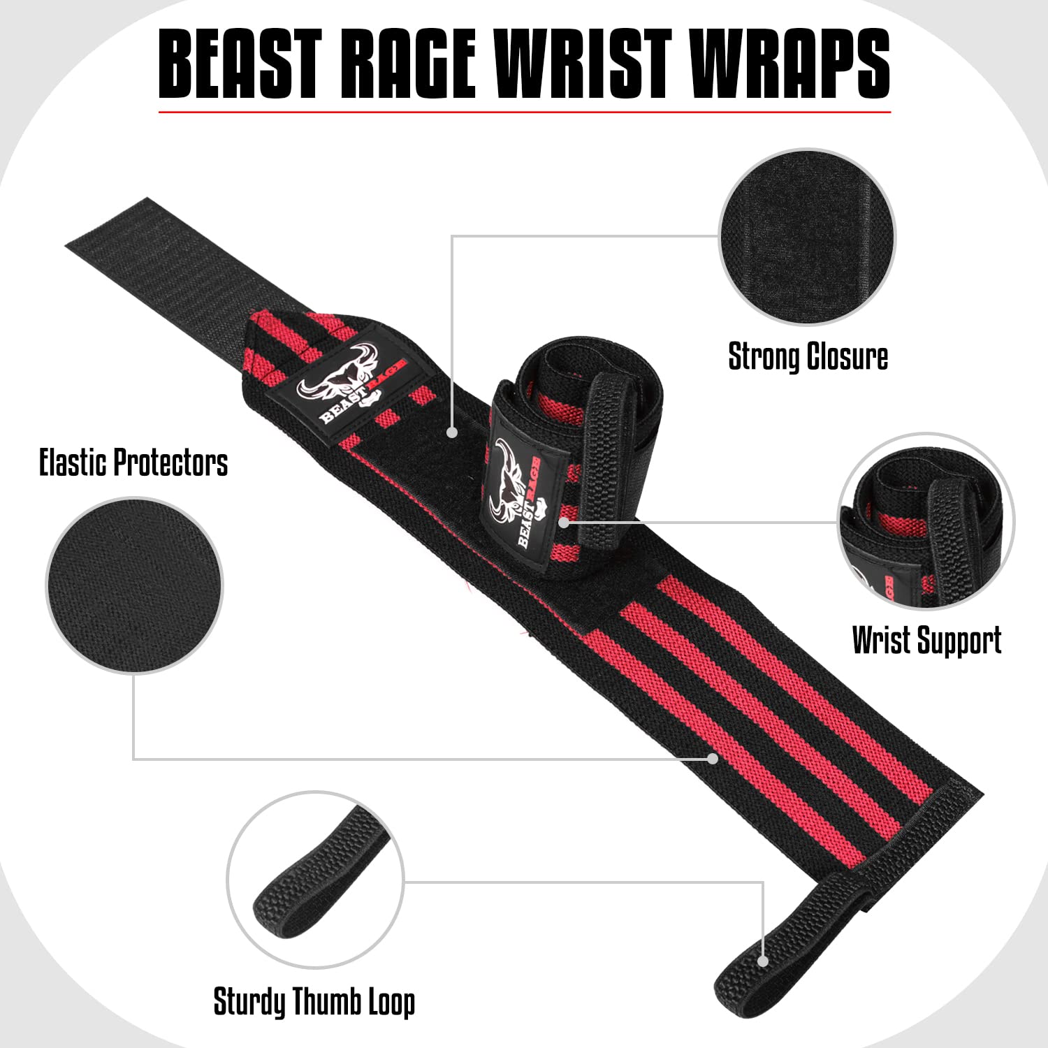 BEAST RAGE Weight Lifting Wrist Wraps Muscle Building Performance Training Gym Exercise Fitness Straps Thumb Loop Support Stretchable Cotton Bandage Brace Training Cuff (Black/Red)