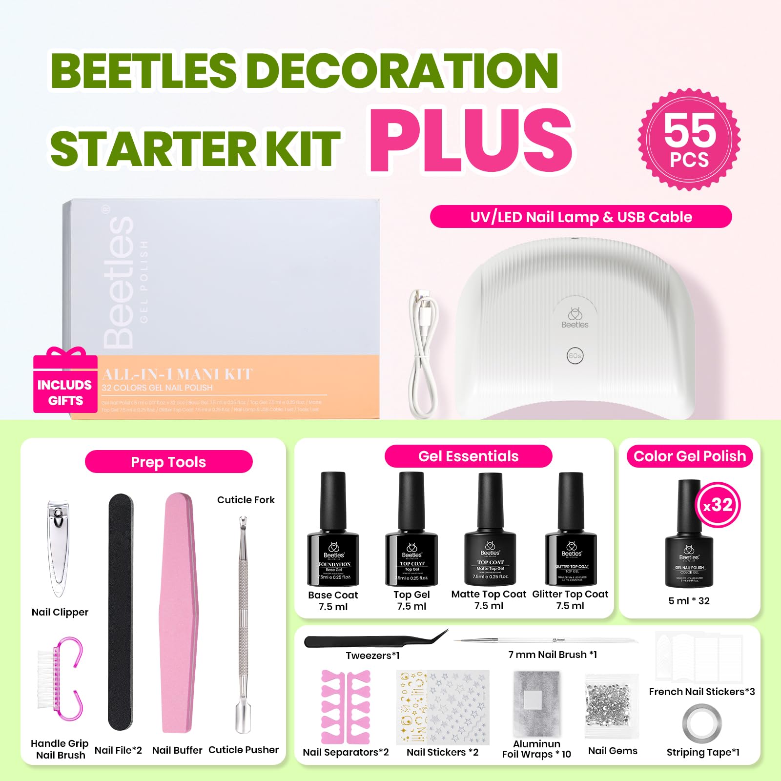 Beetles Gel Nail Polish Kit with U V Light, 32 Colors Gel Polish Nail Kit 55 Pcs Gel Polish Set Base & Matte and Glossy Top Coat Soak Off DIY Nail Art Set Manicure Gifts for Women
