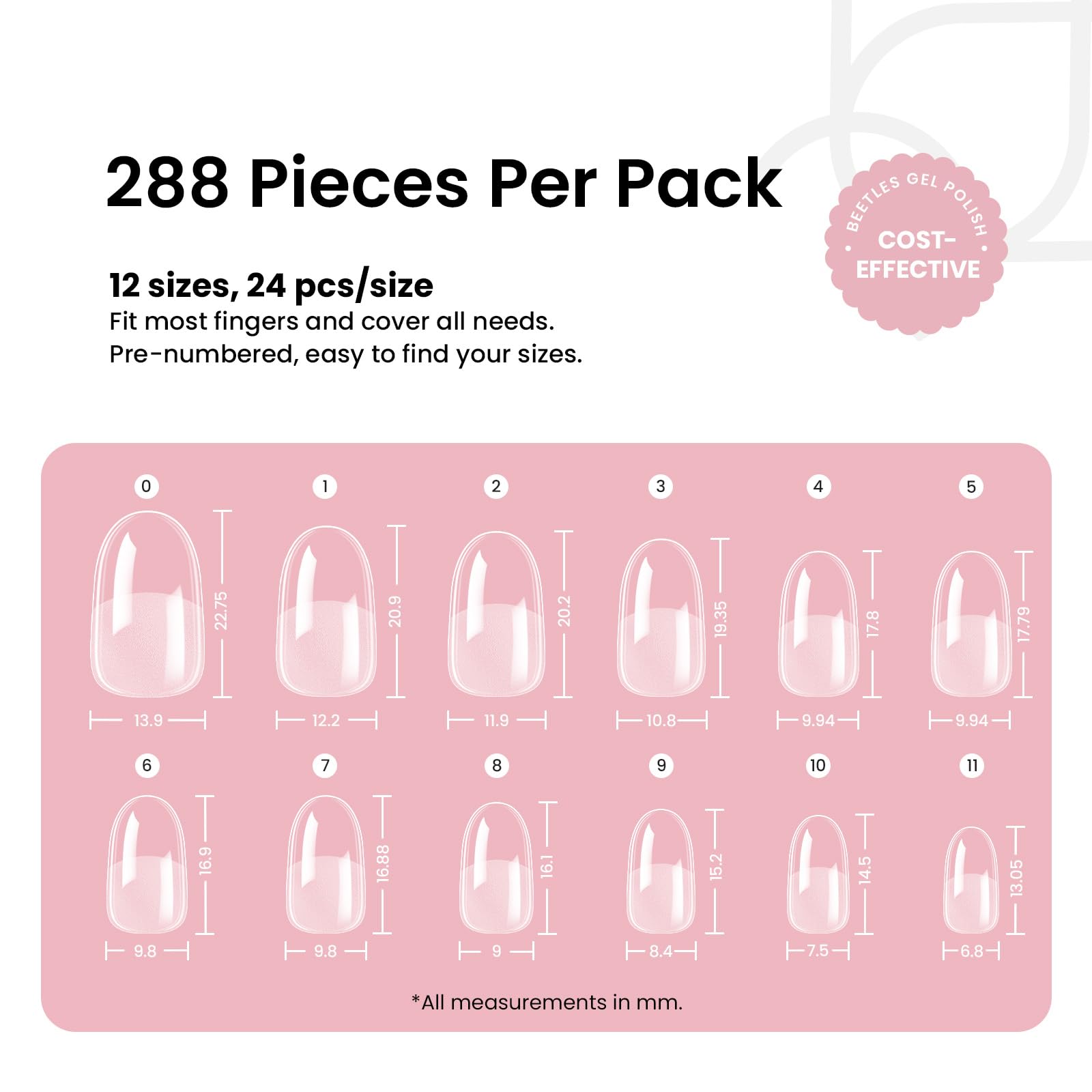 - Short Oval Nail Tips:This 288 PCS false nail tips set comes in 12 sizes for effortless matching to each finger. Each nail tip in the half matte series features a thinner edge, stronger friction to fit your natural nails, resembling nails that have grown out naturally.