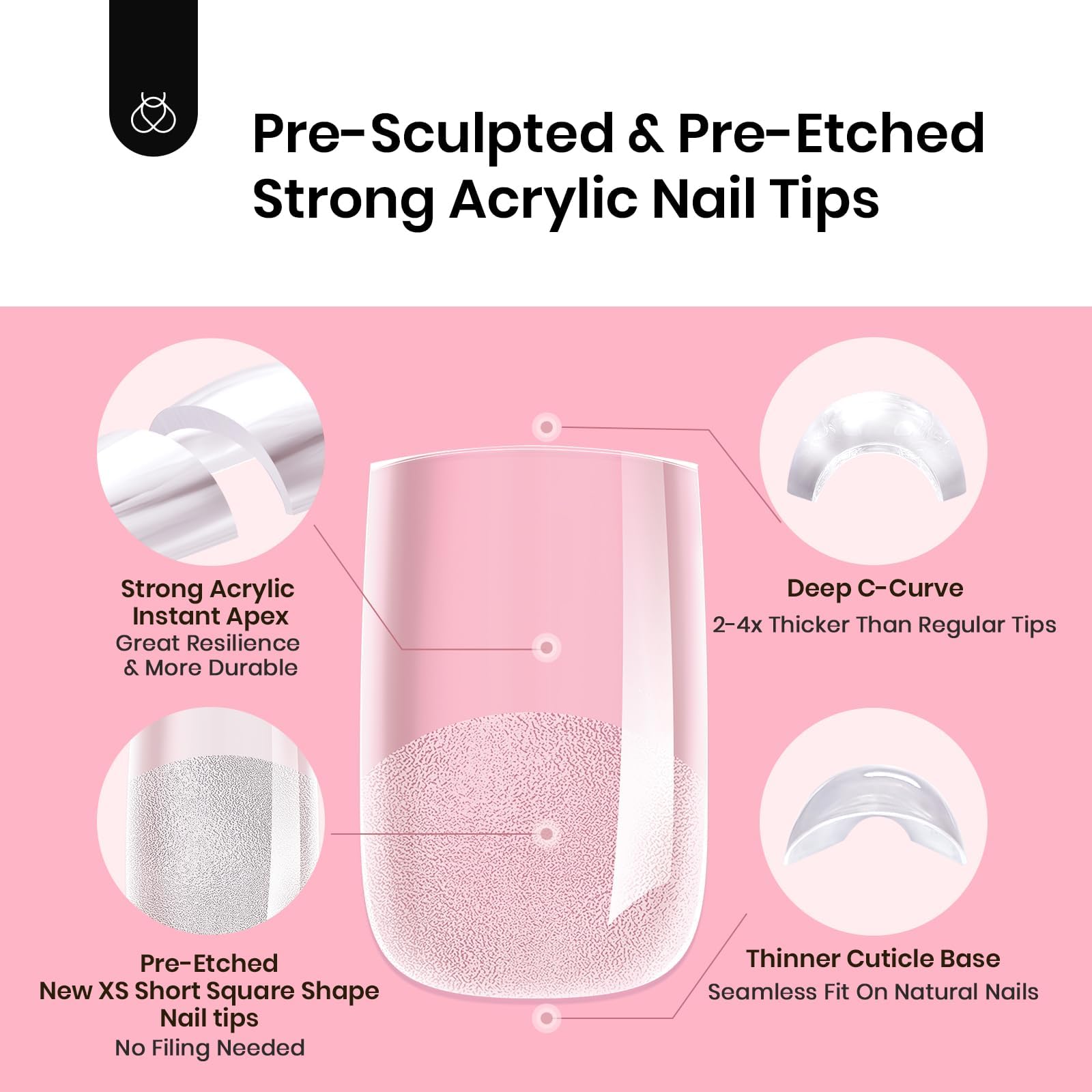 Beetles Tipex Instant Apex Nail Tips-Extra Short Square Pre-Building & Pre-Etched Strong Thick Acrylic,16 Sizes, Press on Nails 512 Pieces