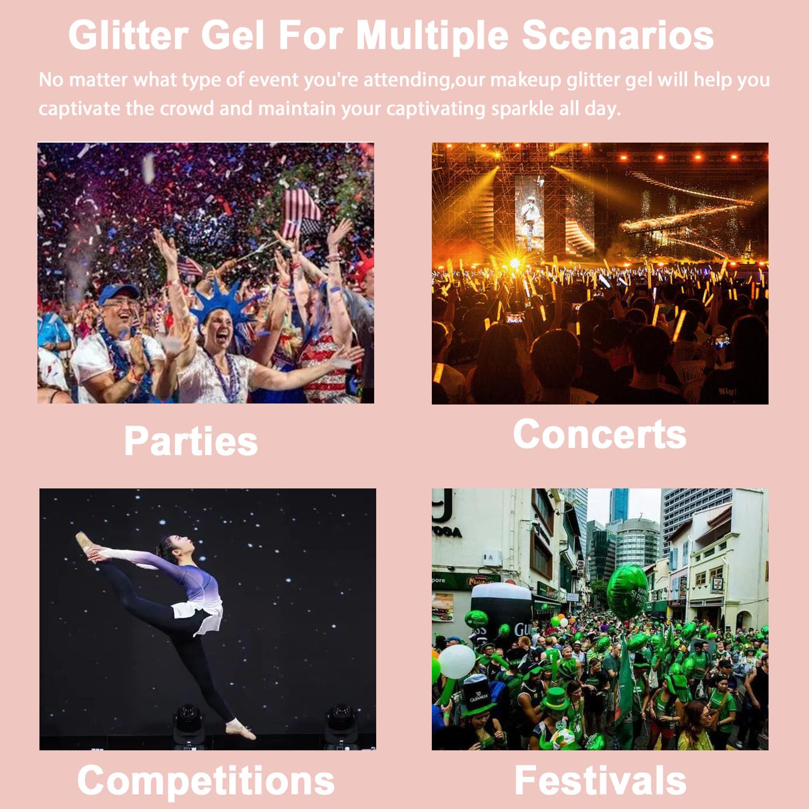 - Sparkle In Vibrant Colors: Choose from our cosmetic glitter gel of 29 vibrant colors. from Mardi Gras, 4 of july Independence Day, Halloween , St. Patrick's, Easter, Christmas, to Coachella, you can experience the dazzling appeal of iridescent glitter. Infused with high-intensity pigments and holographic sparkle, our euphoria glitter lotion creates a mesmerizing effect that truly shines. With just one swipe, you can effortlessly apply your makeup and instantly transform into a radiant beauty.