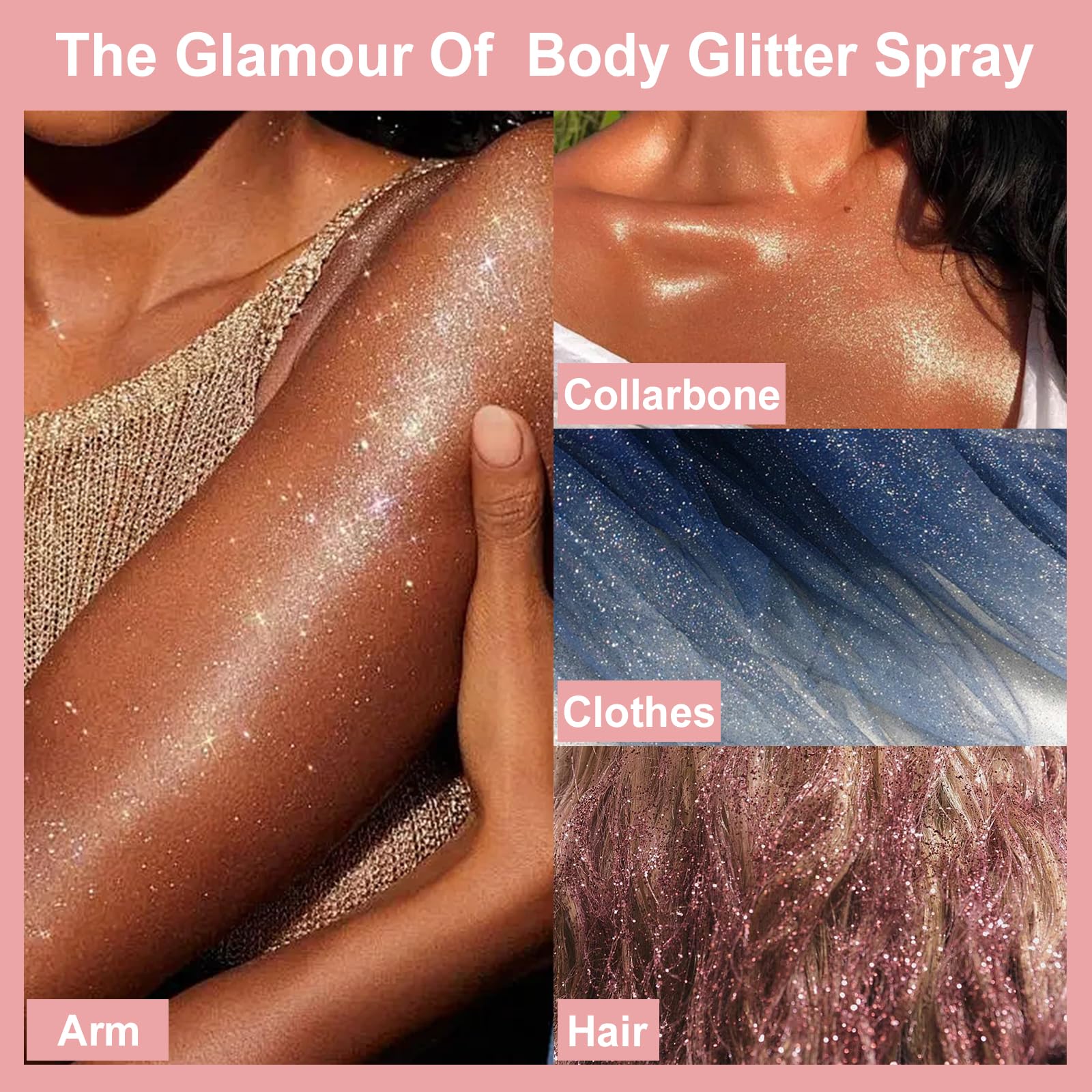 - Glitter Cosmetics: Our hair glitter spray is great for sparkling your look. Whether you're styling for a grand themed event, or attending an upbeat party gathering, this body glitter delivers amazing results. Our body shimmer spray will help you create a sparkling look, show off your glittery charm and make fun easier. Tips: This shiny glitter spray is suitable for use on body, hair and clothes, but must to avoid using it on sensitive areas such as face, eyes or injured or broken skin.