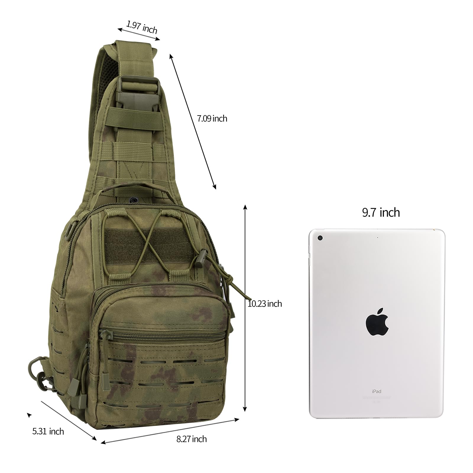 - 【SMALL&LIGHTWEIGHT】Tactical sling bag size: 8.27*5.31*10.23 inches (L*W*H).Weight: 0.99LBs.Volume: 9L or so. Multiple internal pockets and three external compartments, one front zippered pocket, one main zippered pocket, one padded back pocket, compact enough to keep your necessities organized.