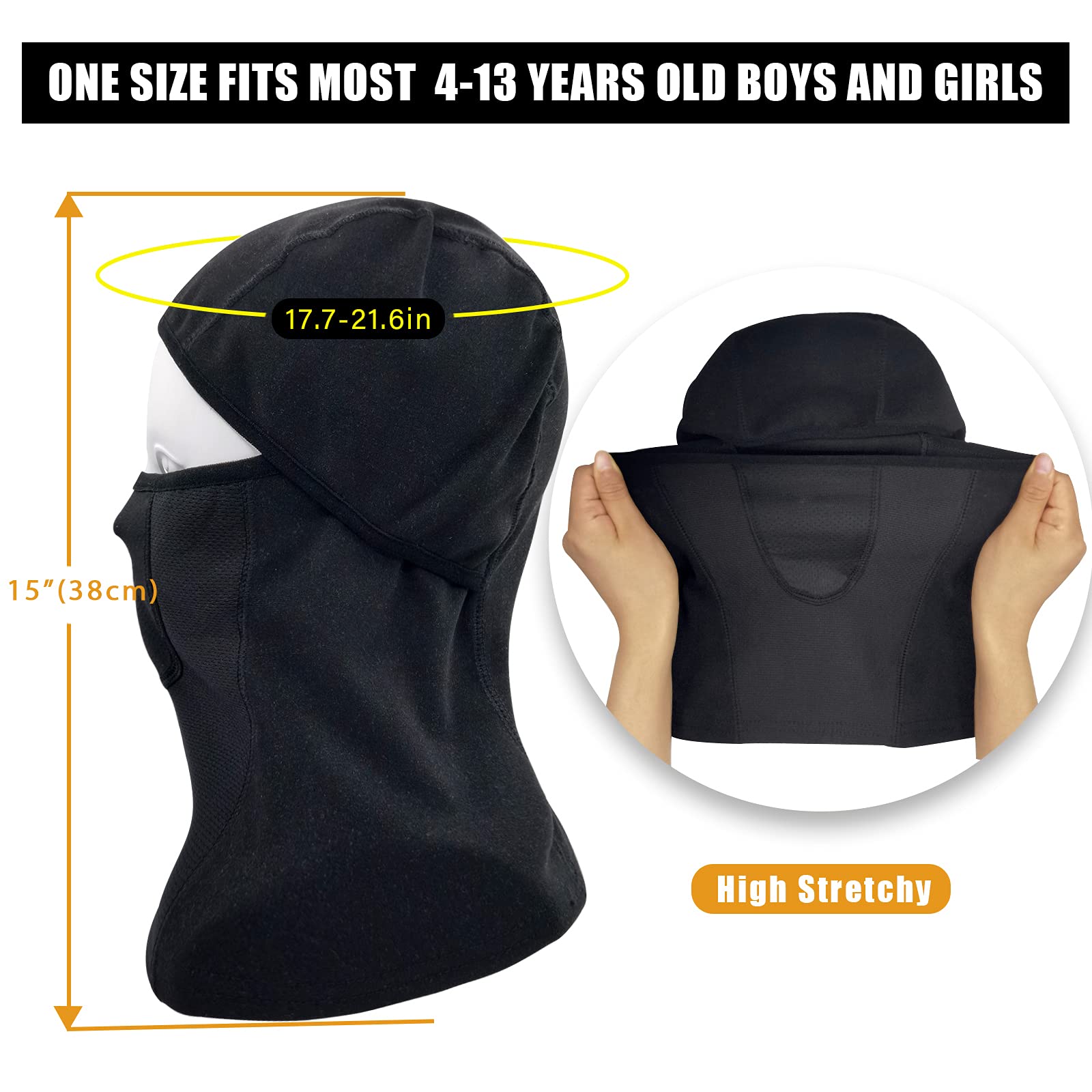 - Universal Size: Our kids balaclava has a particularly good rebound effect. It is made of high-density elastic fabric, which can fit head accurately, even if their head circumference is very large. Suitable for 4-13 years old girls & boys whose head circumference about 45-55cm/17.7-21.6in.