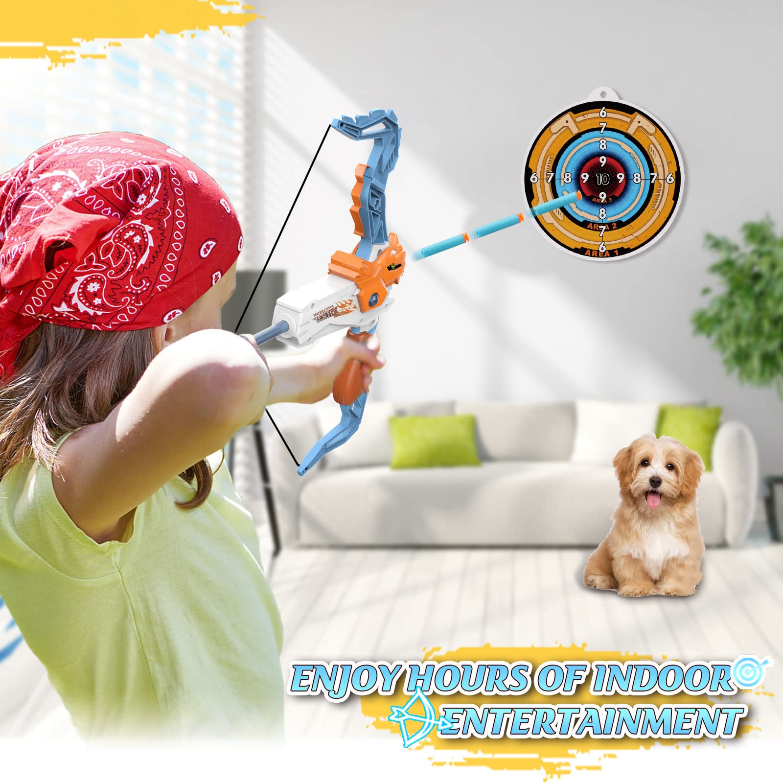- Complete Kit: This bow and arrow toy set comes with 20 foam blaster darts, 2 wrist bands, 1 bow and arrow, and a bull's eye target