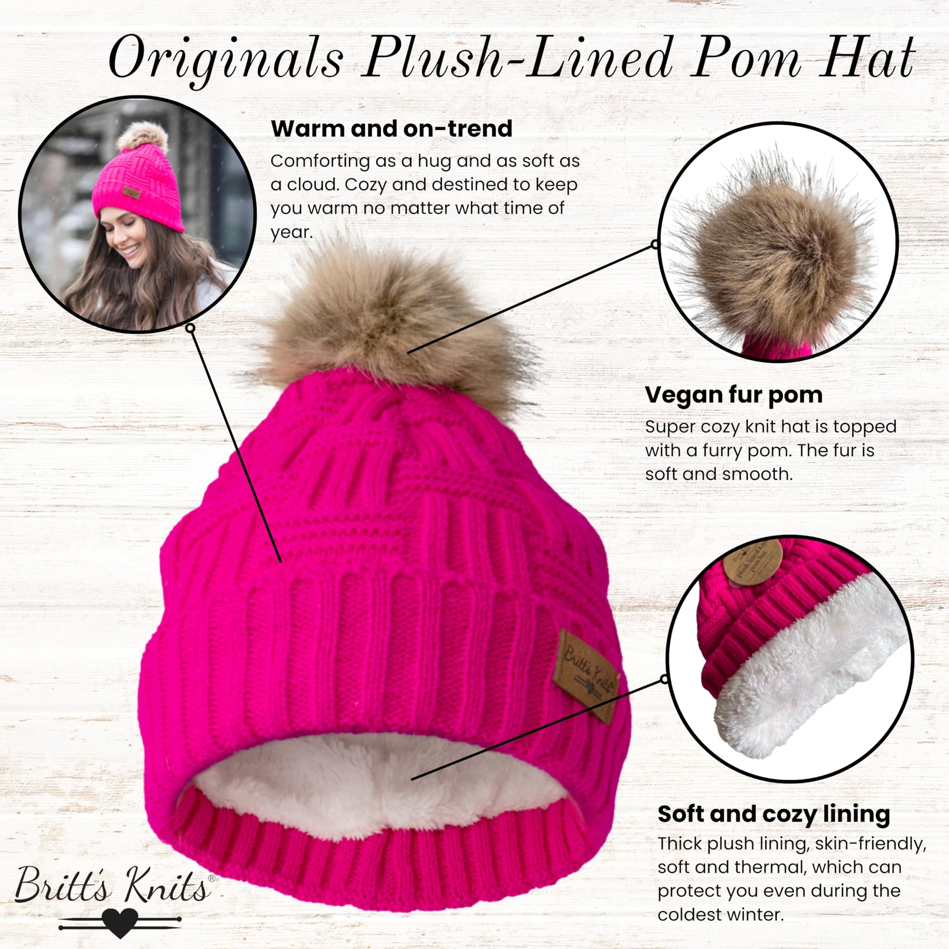 - COZY KNIT: That warm fuzzy feeling in one classic hat. With a vegan fur pom and timeless cable knit design, this plush-lined hat is ultra warm and always in style. Perfect warm hats for cold seasons.
