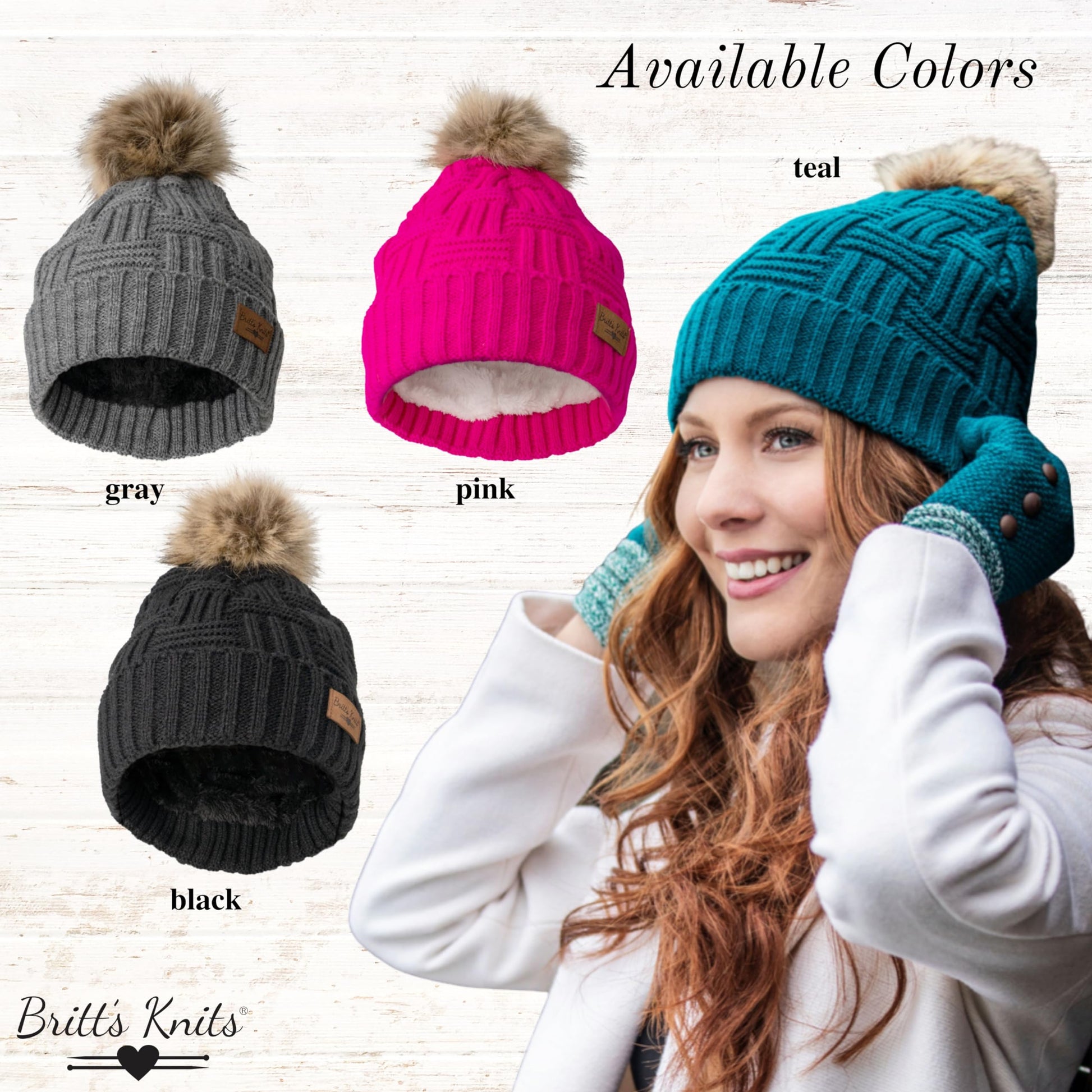 Details: When it comes to weathering the cold in style, Britt's Knits Plush-Lined Knit Hat has you covered! With the rich lining, basketweave-style knit, and a faux fur pom to top it all off, this hat will quickly become your favorite winter weather accessory. Choose from an assortment of colors to match whatever mood you're in! One size fits most.