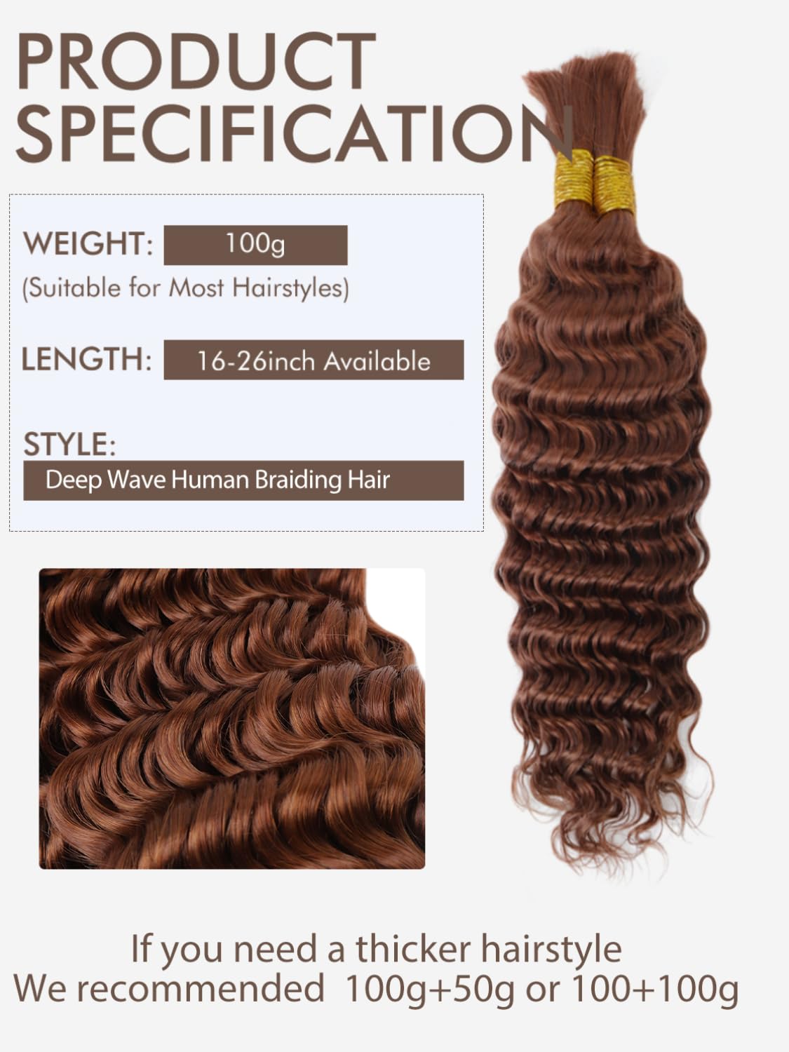 Brown Braiding Hair 100g 24 Inch Color 30 Braiding Hair Deep Wave Human Hair Braiding Hair Water Wave Bulk Human Hair for Braiding 100% 12A Brazilian Auburn Brown Human Bariding Hair for Boho Braids