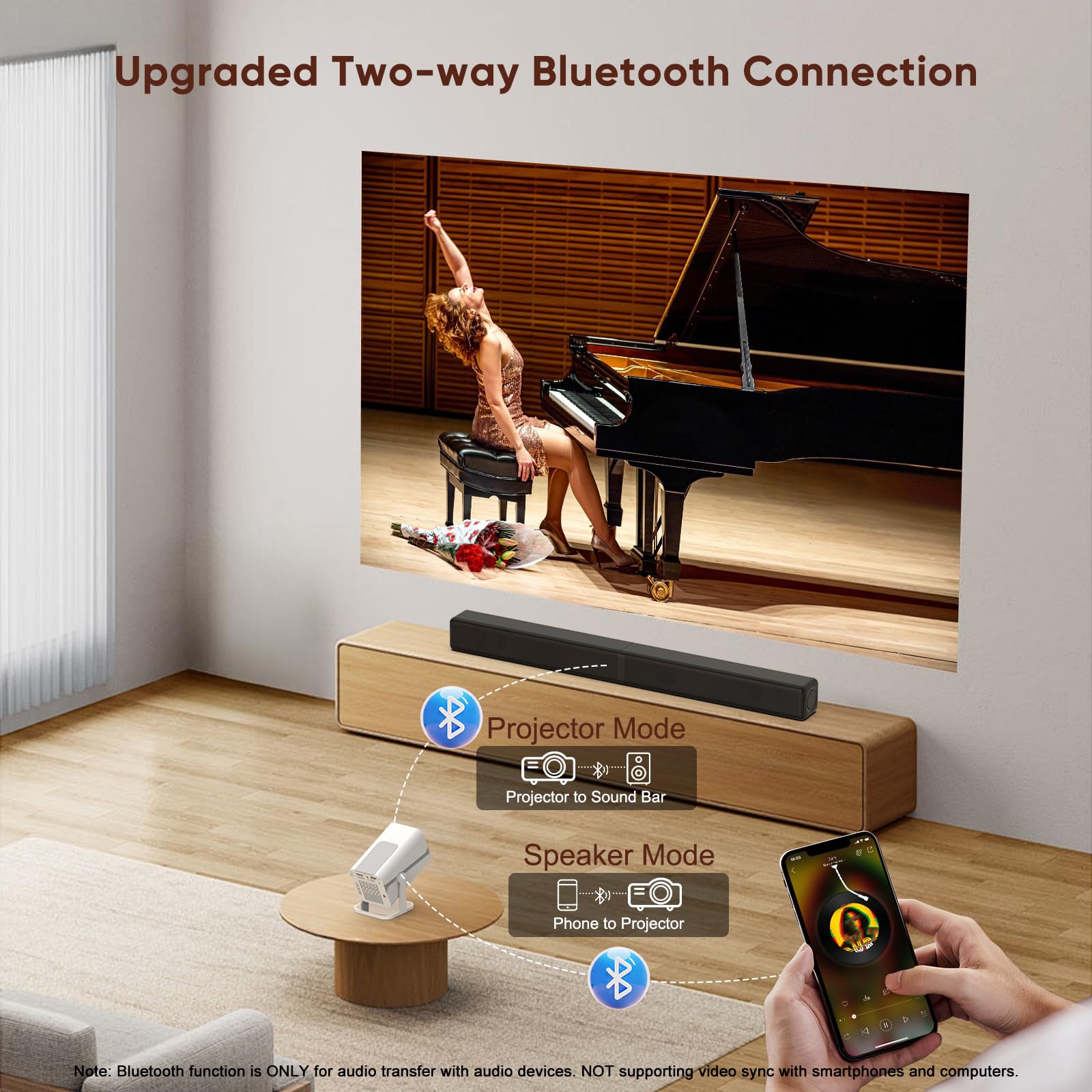- 【Integrated Stereo Speaker & Upgraded Two-way Bluetooth】The projector with built-in 3w speakers, delivers crystal clear and loud enough sound, perfect for small bedrooms or cozy movie nights. For an even richer experience, Bluetooth capability allow you to effortlessly pair with external speakers, soundbars or headphones. Perfect for amplifying outdoor movie nights, backyard parties, or private viewing sessions; You can also use the projector as a standalone speaker via Bluetooth connection with your phone (only for audio transfer)