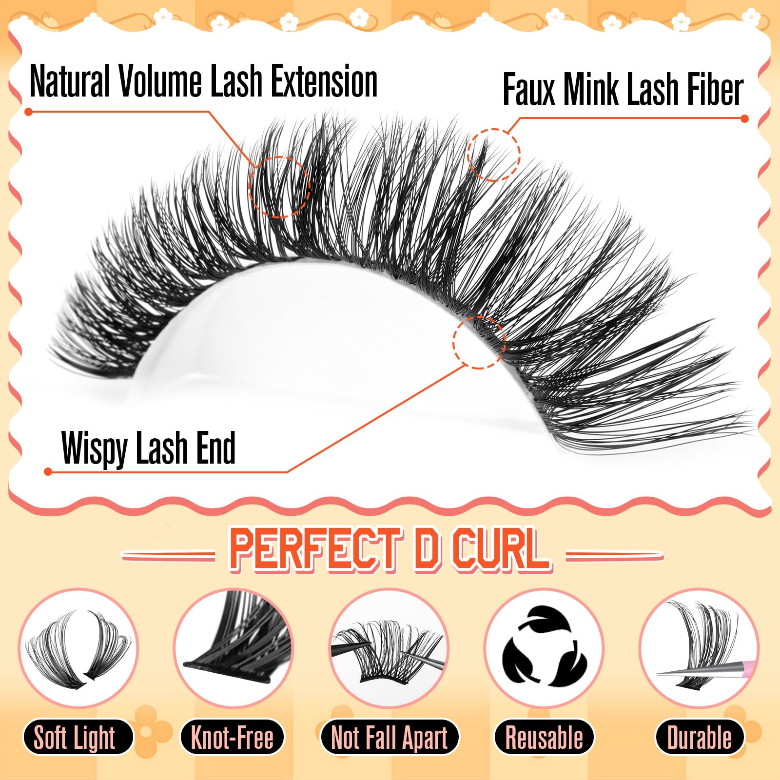 - 【Seductive Cluster Eyelash Extensions】D Curl cluster lashes help you easily create a charming big eye makeup look. The proper curl of eyelashes clusters can effectively enhance the overall look, creating amazing lash look