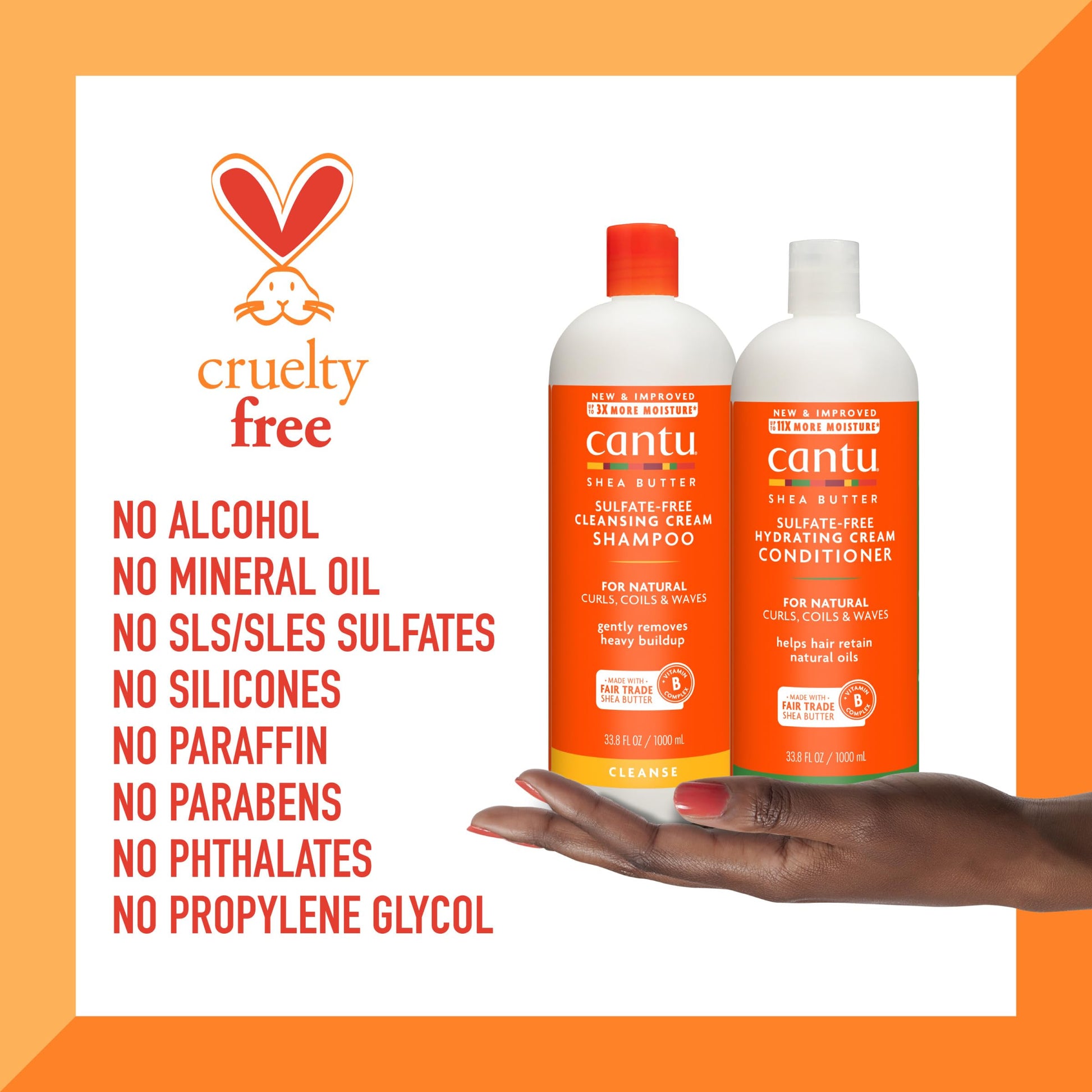 Details: Do wash day the right way with Cantu Shea Butter for Natural Hair Sulfate-Free Cleansing Cream Shampoo and Cantu Shea Butter for Natural Hair Sulfate-Free Hydrating Cream Conditioner! Crafted with an award-winning blend of pure shea butter and essential oils, the Cleansing Cream Shampoo produces a rich lather that conditions as it cleanses, gently removing product buildup without drying out hair. For best results, apply a quarter-sized amount to wet hair and work into a lather. Massage into the scalp, and rinse. Repeat as needed. For best results, follow up with the Hydrating Cream Conditioner to help protect curls against breakage and split ends for stronger, healthier hair for best results and enjoy ultimate hydration and complete conditioning that delivers an added layer of moisture after shampooing. Enjoy ultimate cleansing, hydration and complete conditioning, formulated without the use of harsh ingredients like mineral oil, drying alcohol, sulfates, parabens, silicones, phthalates, paraffin, or propylene. Since the beginning, you’ve pushed us to advance skin and hair science to honor your locs, your curls, your waves, your braids, your natural. At Cantu, we support your journey with care and we celebrate all the styles you rock!