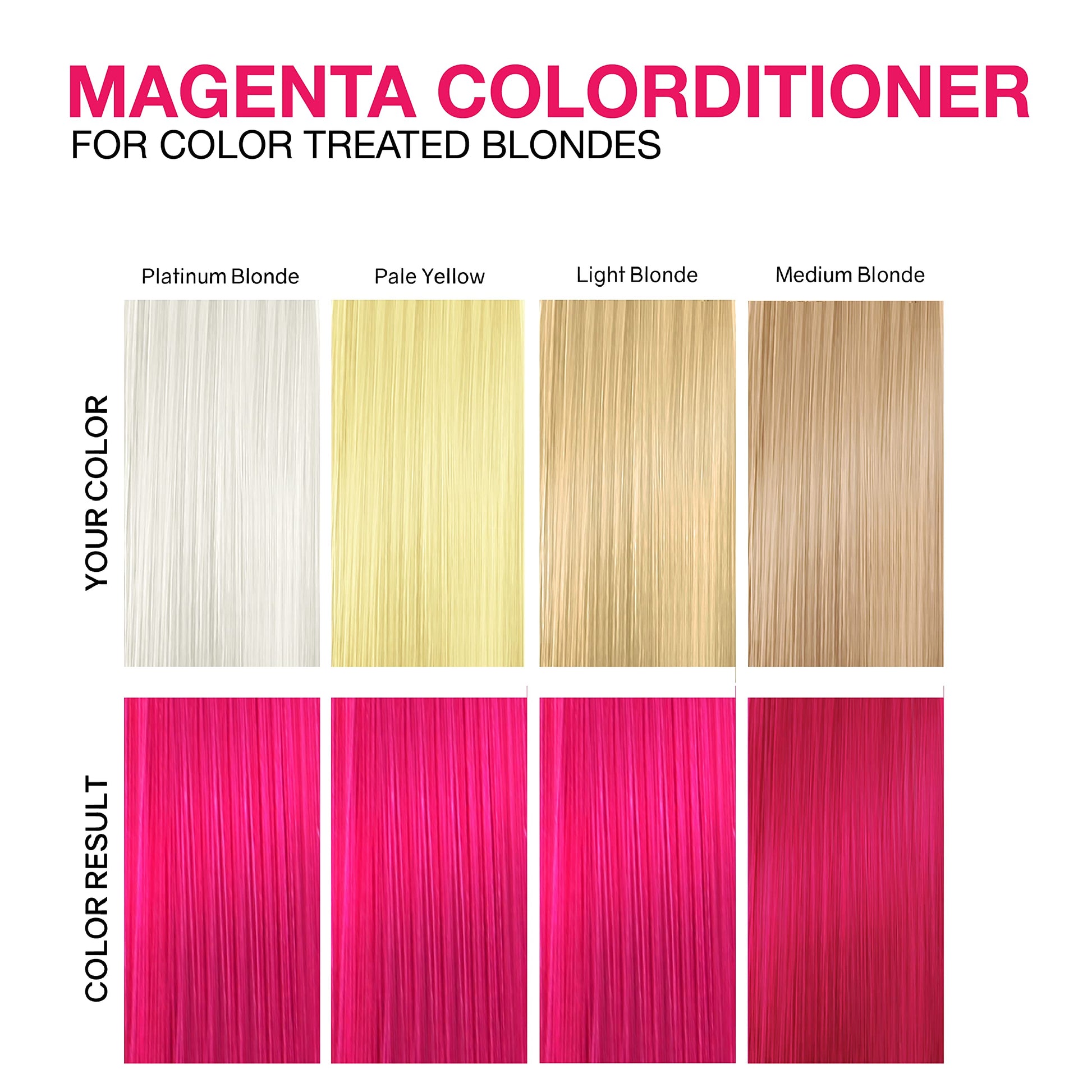 Whether you want to change your overall color or achieve multi-color effects, we have the Colorditioner for you. For vivid, bold tones, use on hair that’s prelightened white to the palest blonde. And for jewel tones, use on medium blonde to brown hair. Have fun!