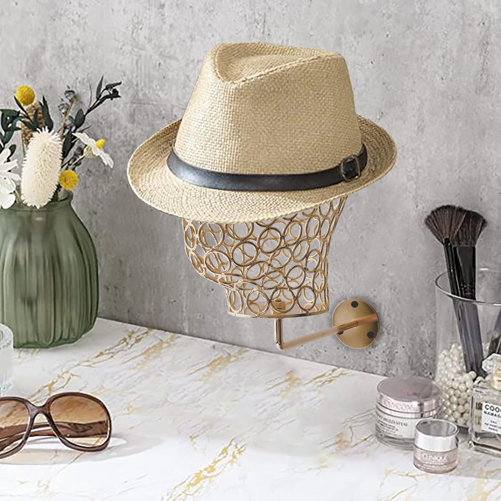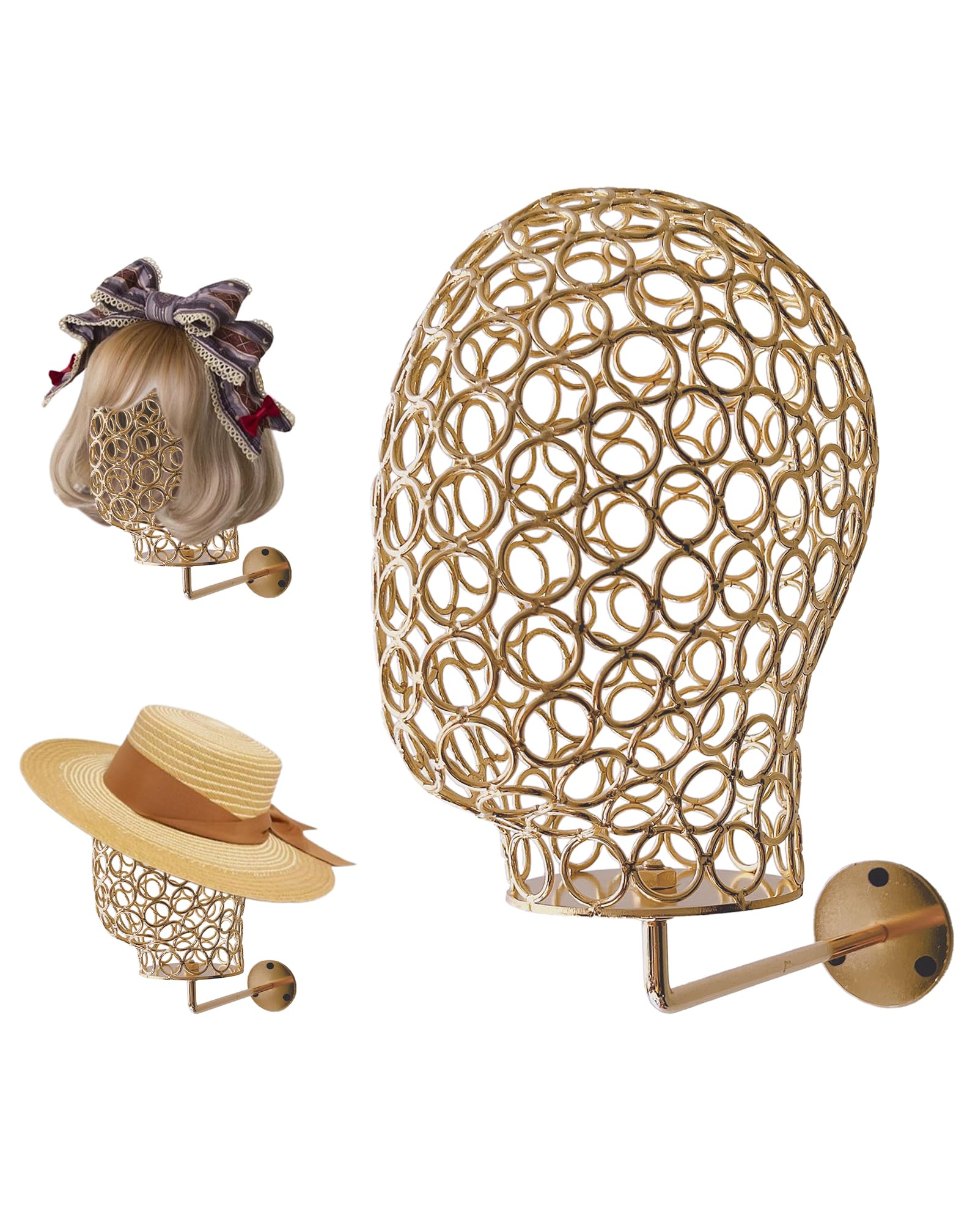 CHADWICK Wall Mount Hat Stand - Metal Hollow Mannequin Head Stand, Hanging Wig Holder 21Inch, Drying and Storage Organizer Rack, Display for Wigs, Caps, Earrings - Chrome Gold