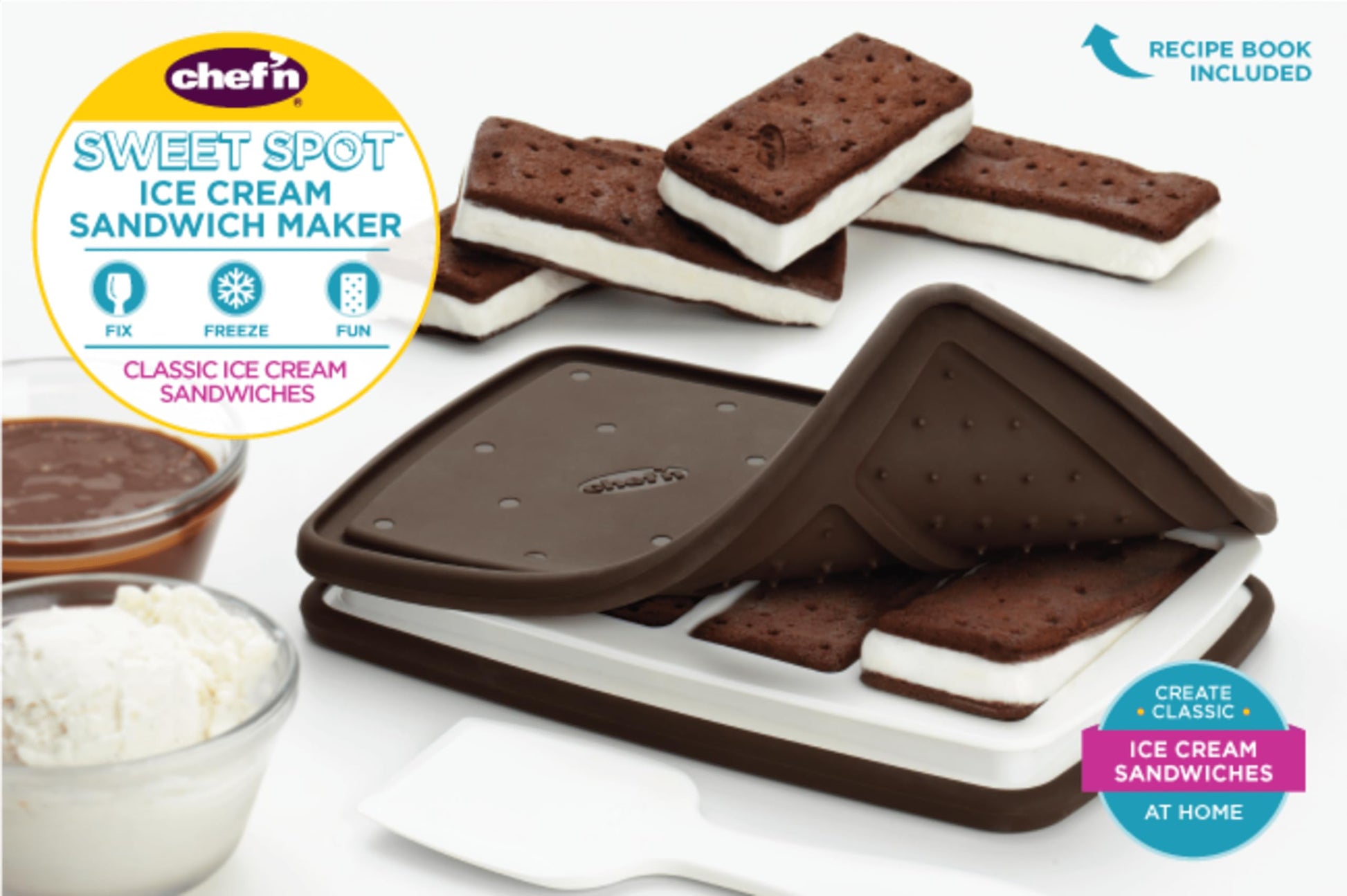- Homemade ice cream sandwich maker by Chef'n. Easily and quickly craft ice cream sandwiches at home using the included tool to scoop ice cream into the maker. Works with included recipe or boxed brownie mix, making four sandwiches at once.