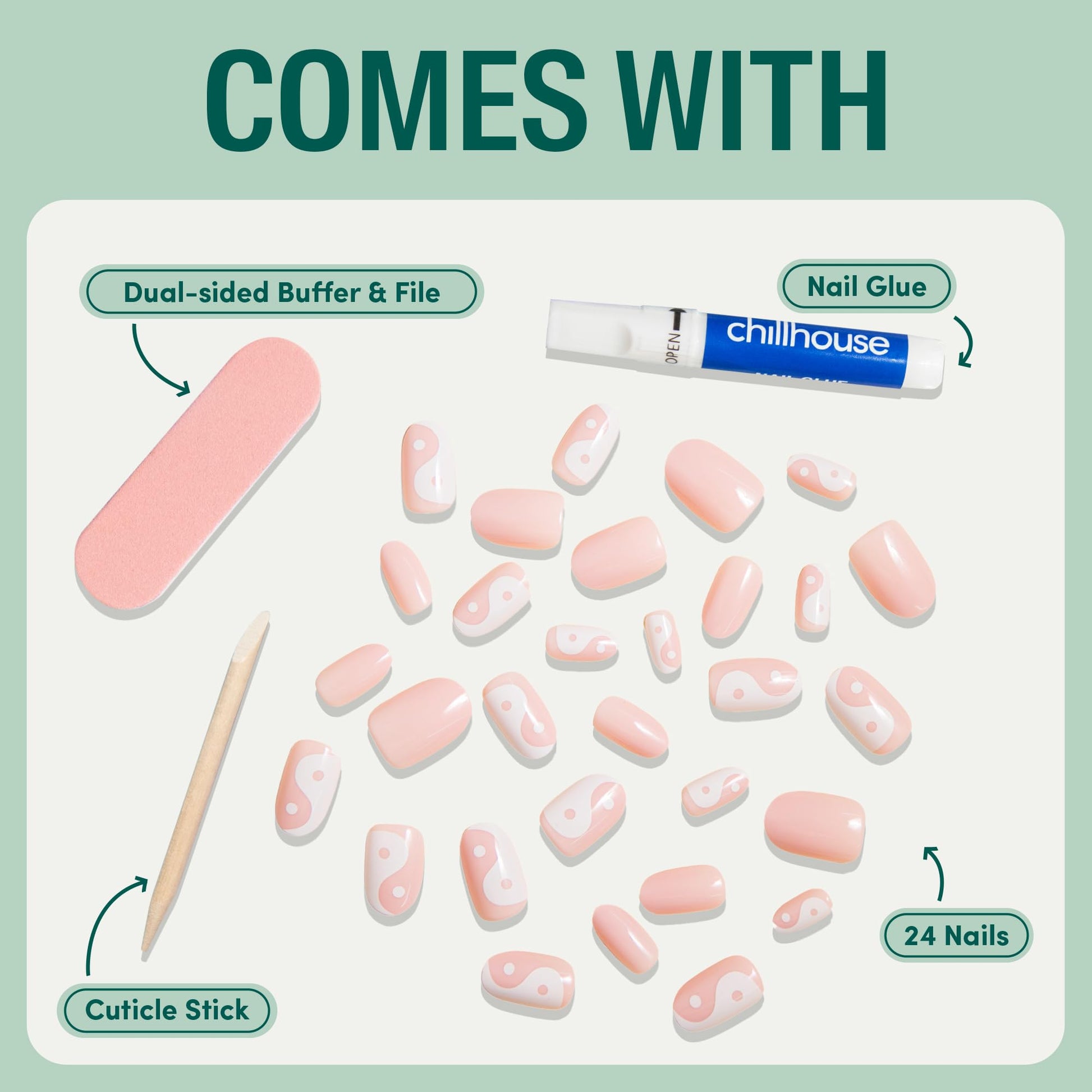 - Iconic Press-Ons for an Iconic You - Meet Chill Tips. Professional-grade nail art manicures in an easy, 15 minute application. Includes 24 Everything Zen (Oval Tips) nail shapes & sizes, dual-sided buffer & file, cuticle stick, and Gentle nail glue.