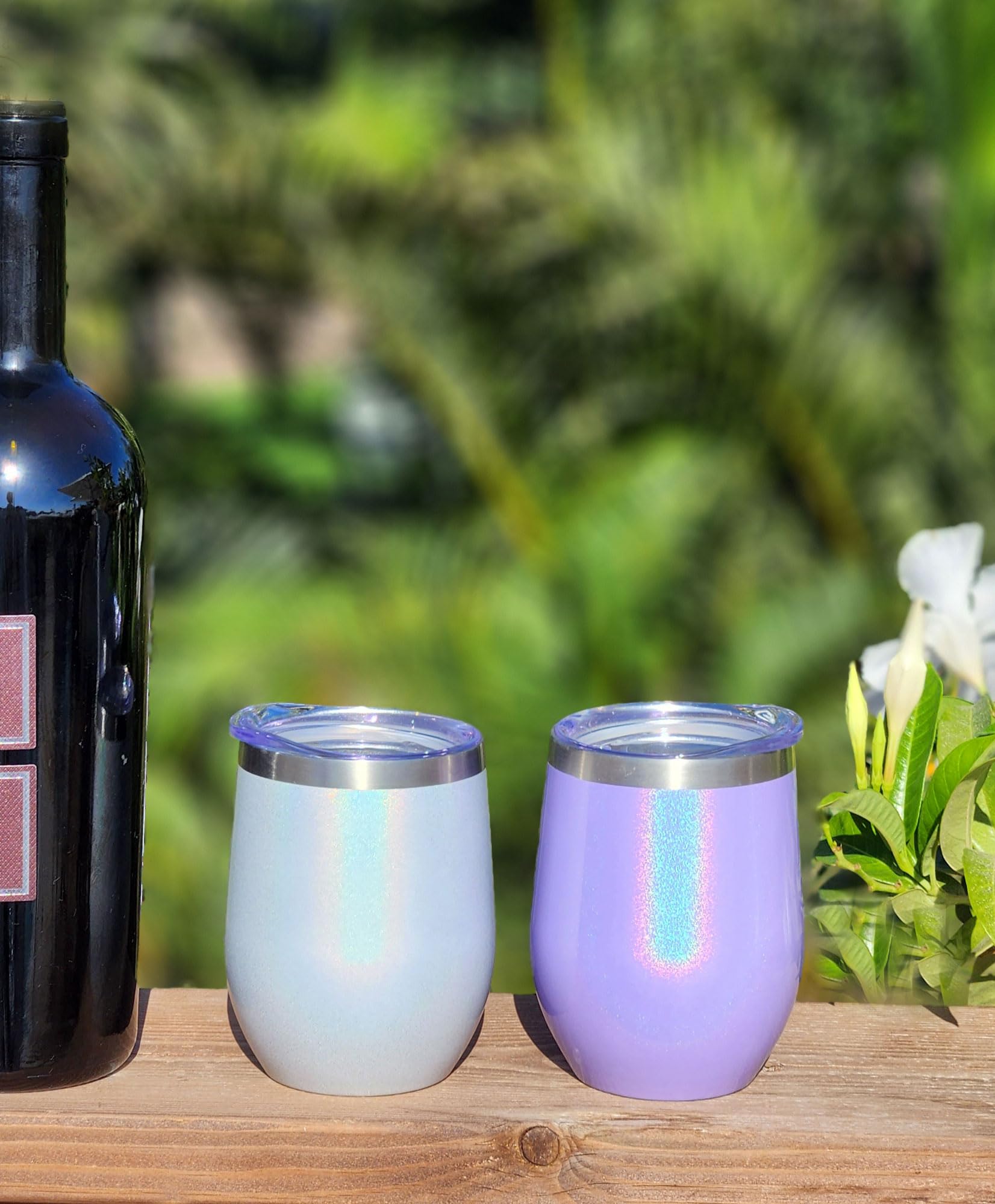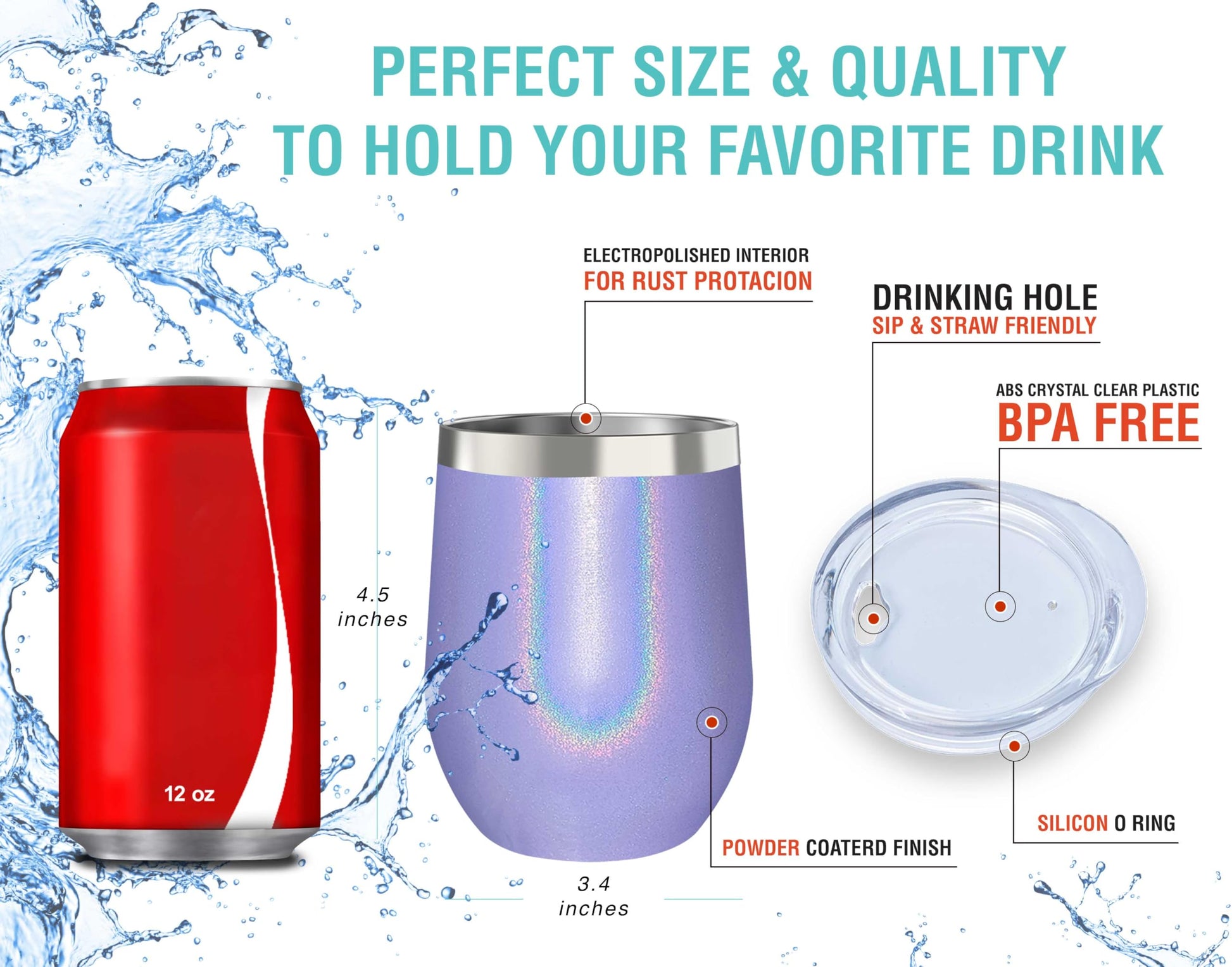 - Double Wall Vacuum Insulated Perfection in Purple Sparkle wine tumbler made from lifelong Stainless Steel! Set off on your refreshing picnic, hiking or camping adventures with your water, wine, or cocktail icy-cold for 9 hours or your coffee & tea scalding-hot for over 3 hours! It is an insulated stainless steel wine glass with a removable BPA-free lid, designed for sweat-free convenience! Use it as a wine glass tumbler or stick your straw in your refreshing drink through the straw-friendly lid!