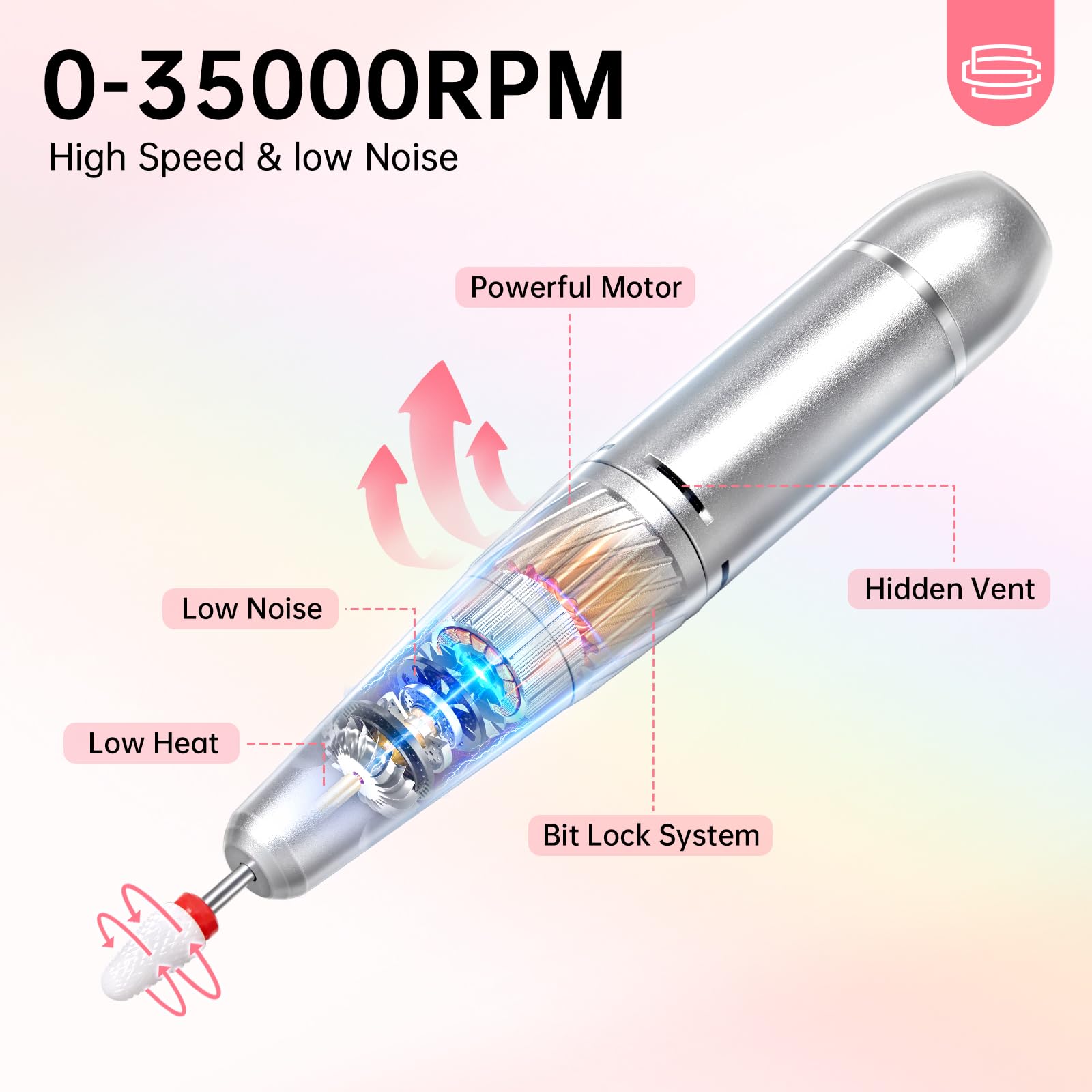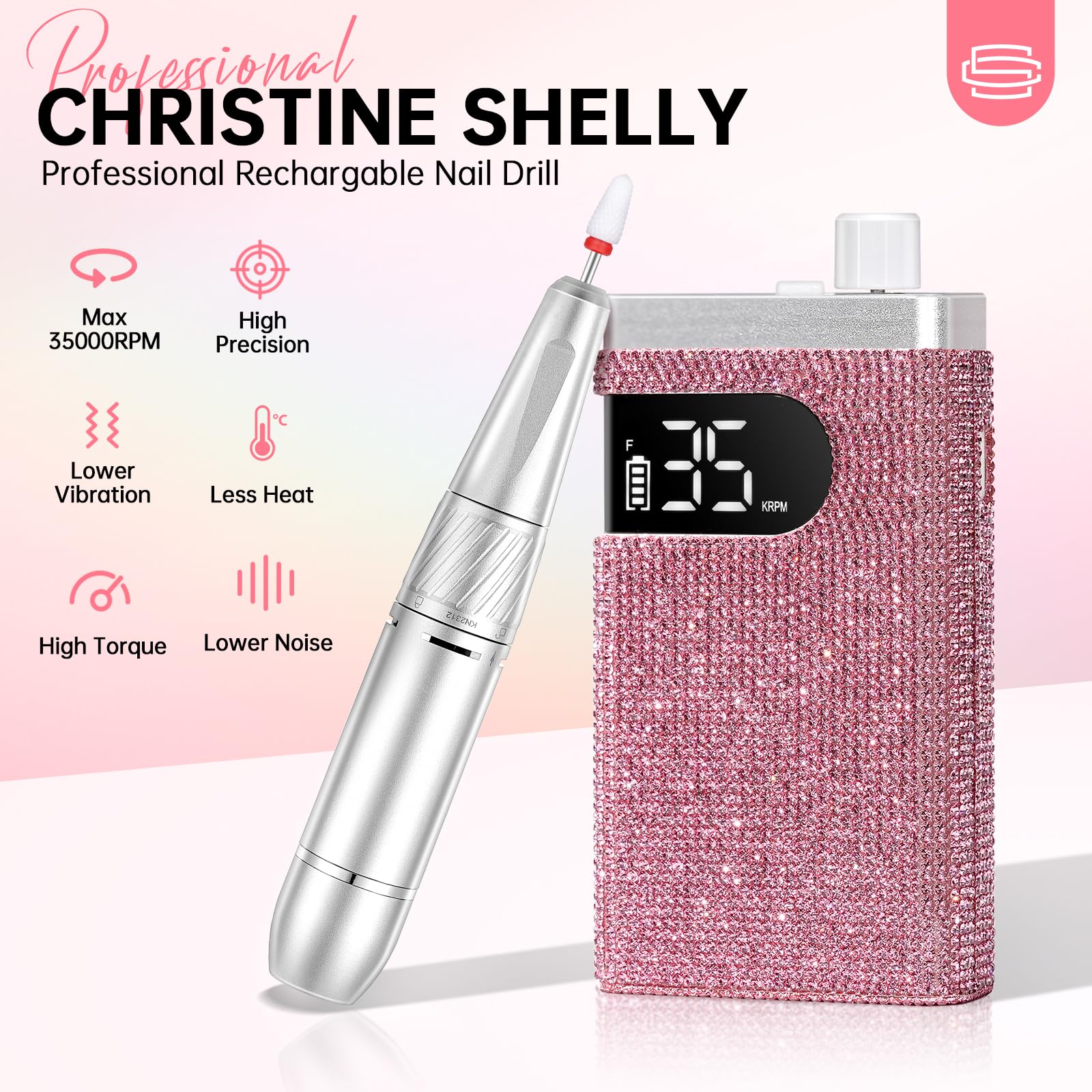 CHRISTINE SHELLY Rechargeable 35000RPM Nail Drill Sparkling Portable Professional Electric Nail File for Acrylic/Gel Nails Professional Nail Tools for Manicure Pedicure, Pink