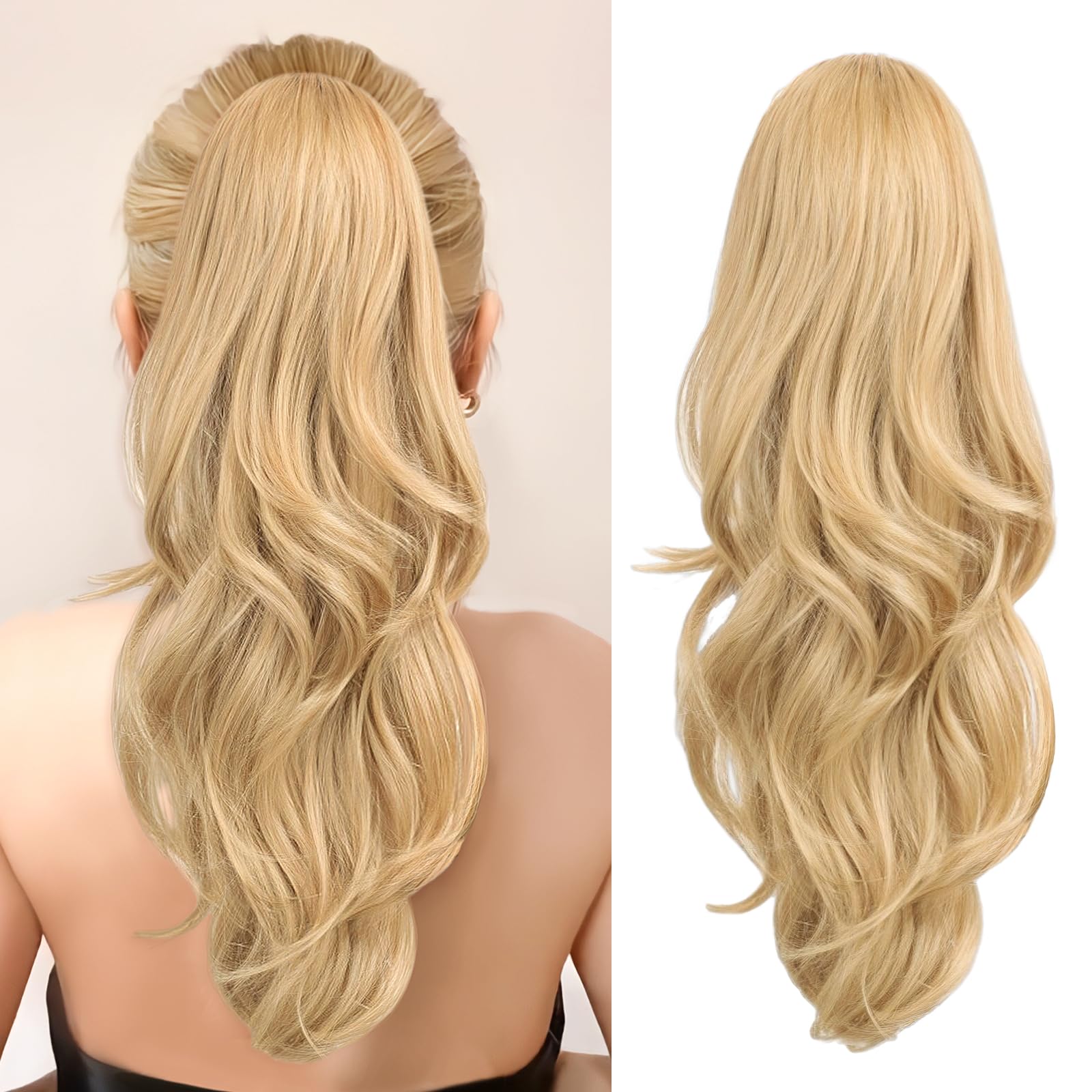CHRSHN Blonde Ponytail Extension, 20 Inch Drawstring Ponytail Extension for Women Long Blonde Wavy Layered Pony Tails Hair Extensions Synthetic Clip in Ponytail Hairpiece for Women(27/613)