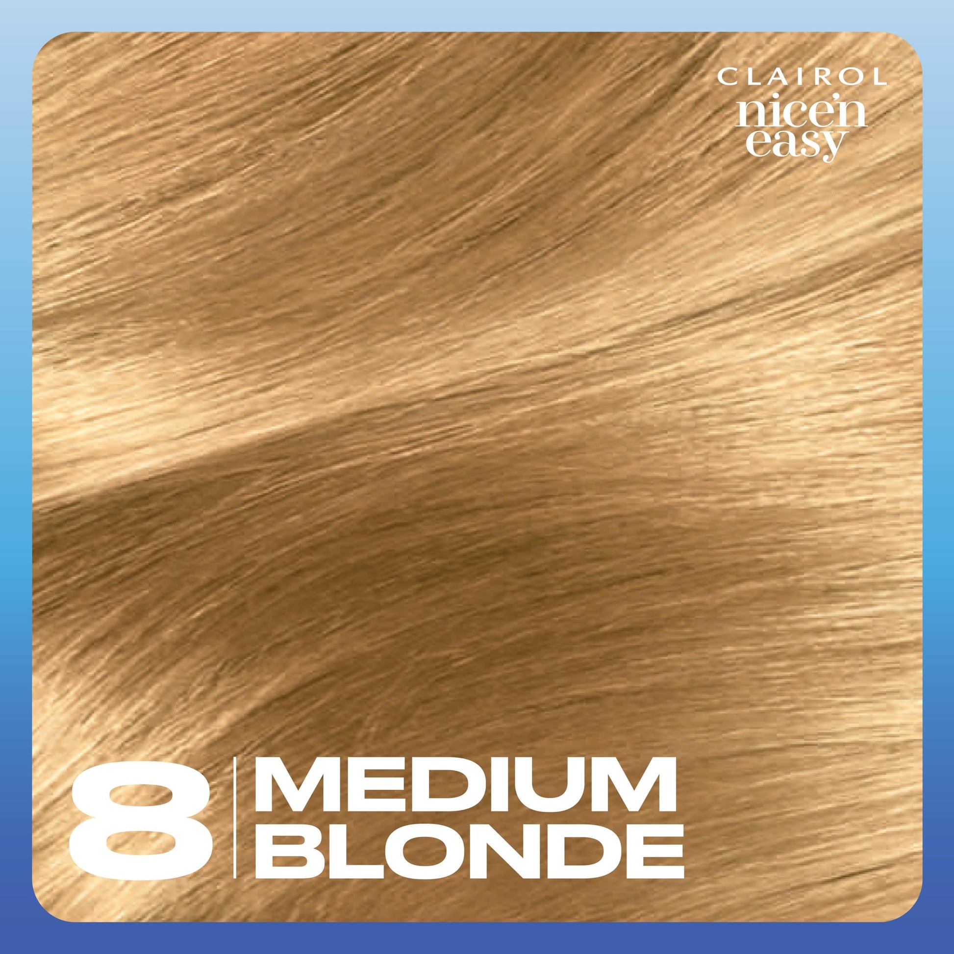 - Clairol Nice'n Easy 8 Medium Blonde. Permanent natural looking color with 100% gray coverage.