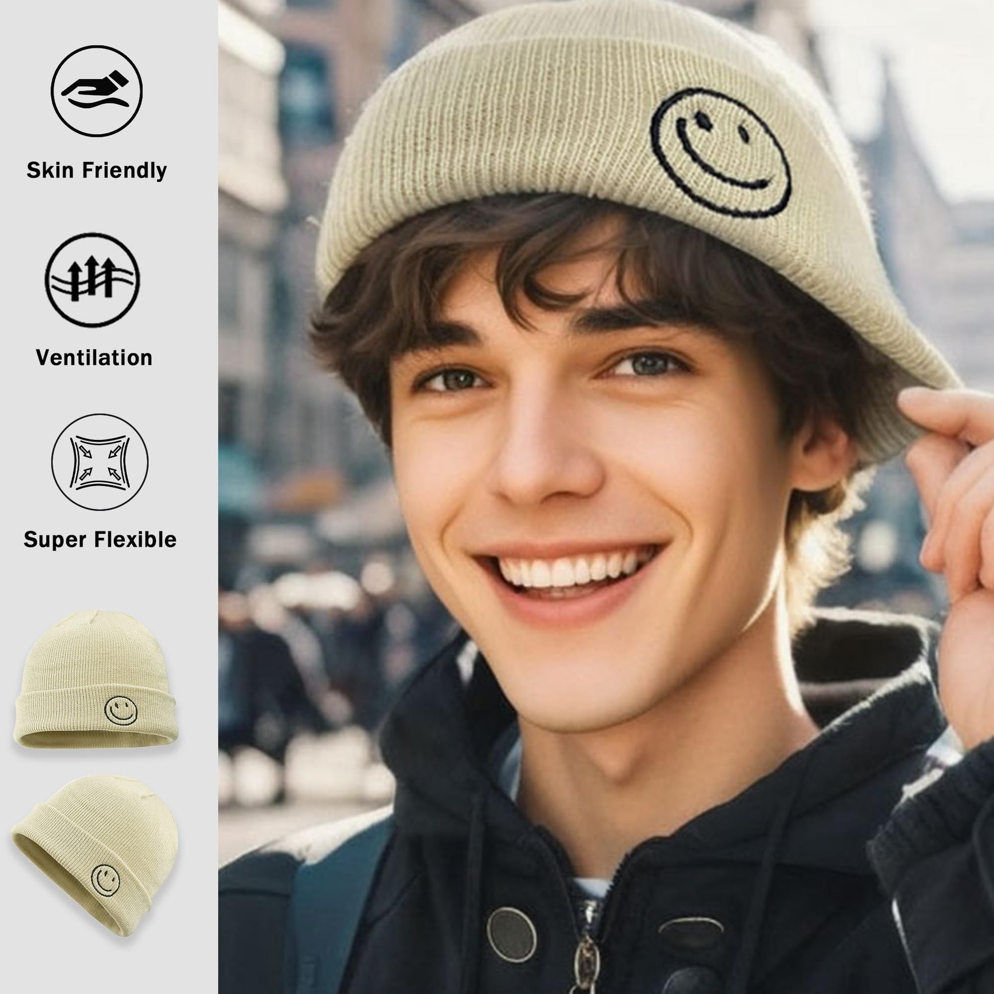 CLAPE Beanie Hat for Men, Cute Embroidery Smiley Face Winter Hat Women Outdoor Ski Snowboarding Knit Cuffed Fisherman Beanie