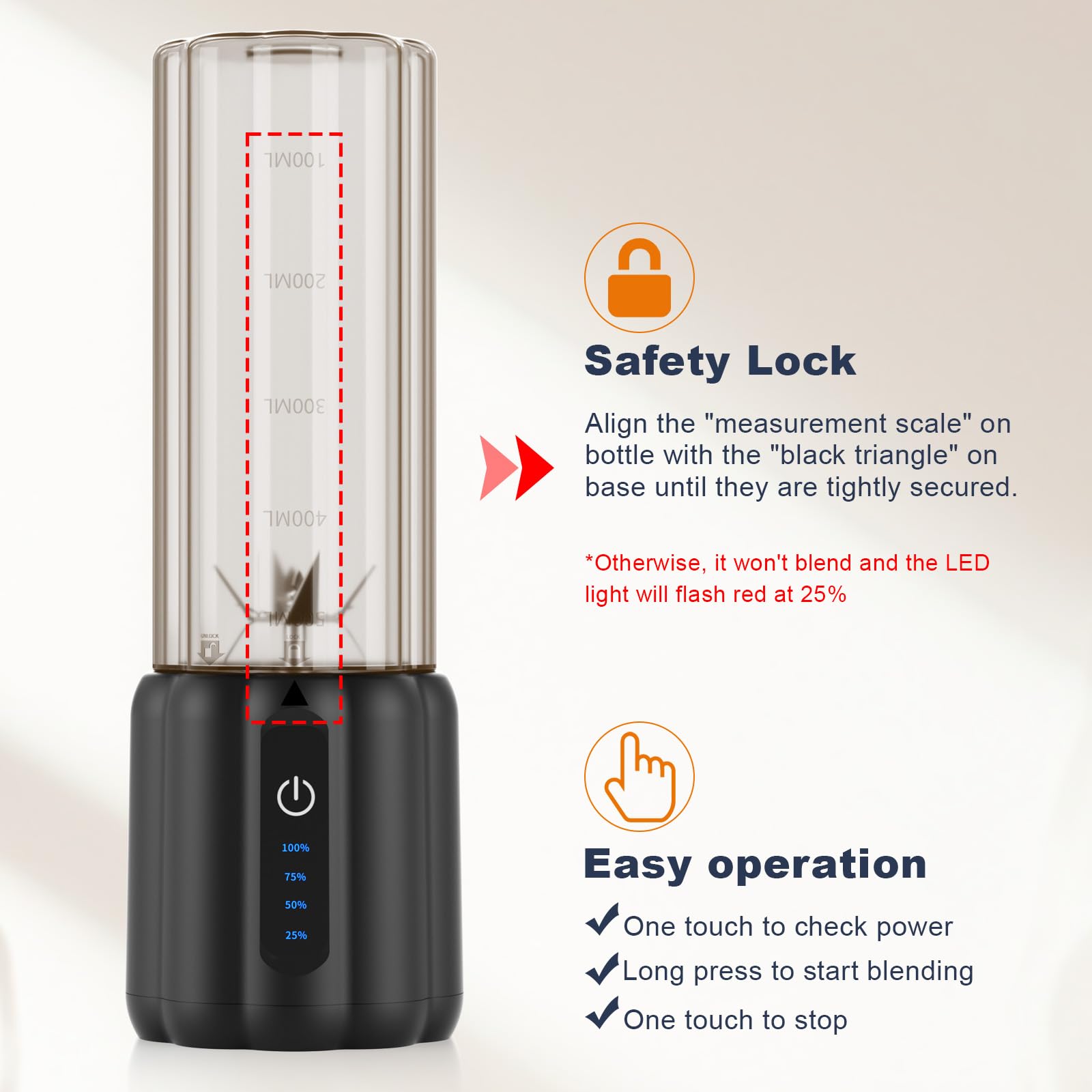 - UPGRADED SAFETY LOCK SYSTEM: With our magnetic induction personal smoothie blender, easy to lock the blender on the go, and safe to rotate only when the bottle and base are tightly secured by align the 'measurement scale' with the “triangle' on base