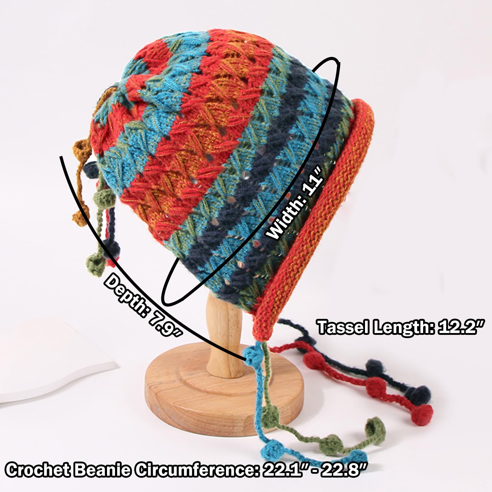 - One Size Fits Most: Designed with a versatile V-shaped back design and cute pom tassels, our one-size-fits-most crochet beanie hat offers a comfortable and adjustable fit for adults of various head sizes. Whether you're a girl, teenager, lady, or mother, these hats are perfectly suited for you. With a cap circumference of 56-58cm (22.0-22.8inch), depth of 20cm (7.9inch), and tassel length of 27cm (10.6inch), this hat provides a stylish and flexible option that can be easily worn