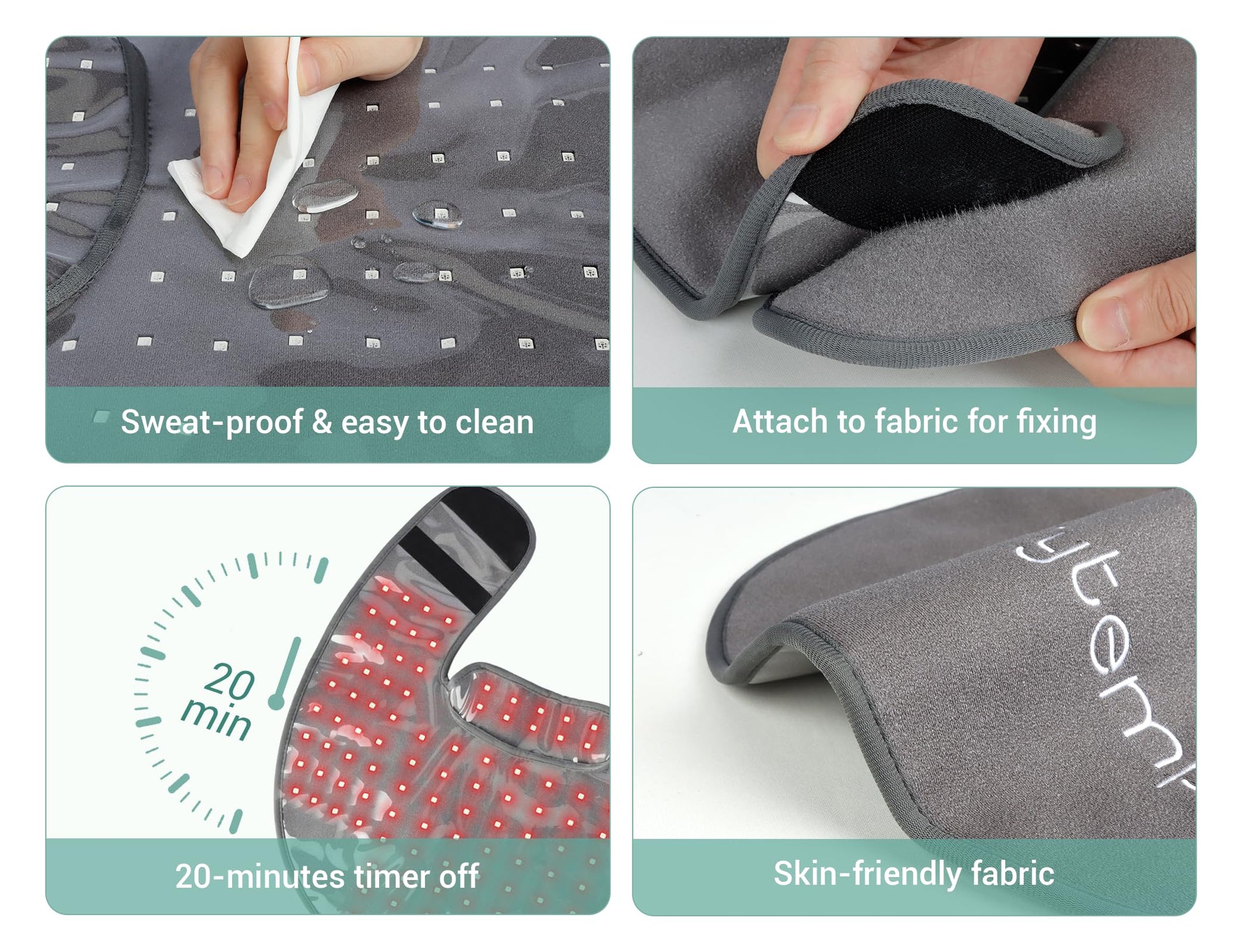 - Designed for Comfort and Effectiveness: Sized at 24.4' x 21.2', our red light therapy pad fits most users. The soft diving composite fabric surface and PVC clear cover ensure easy sweat cleaning, while adhesive buckles on the shoulders keep the pad close to your body. Temperature control settings ensure your usage.