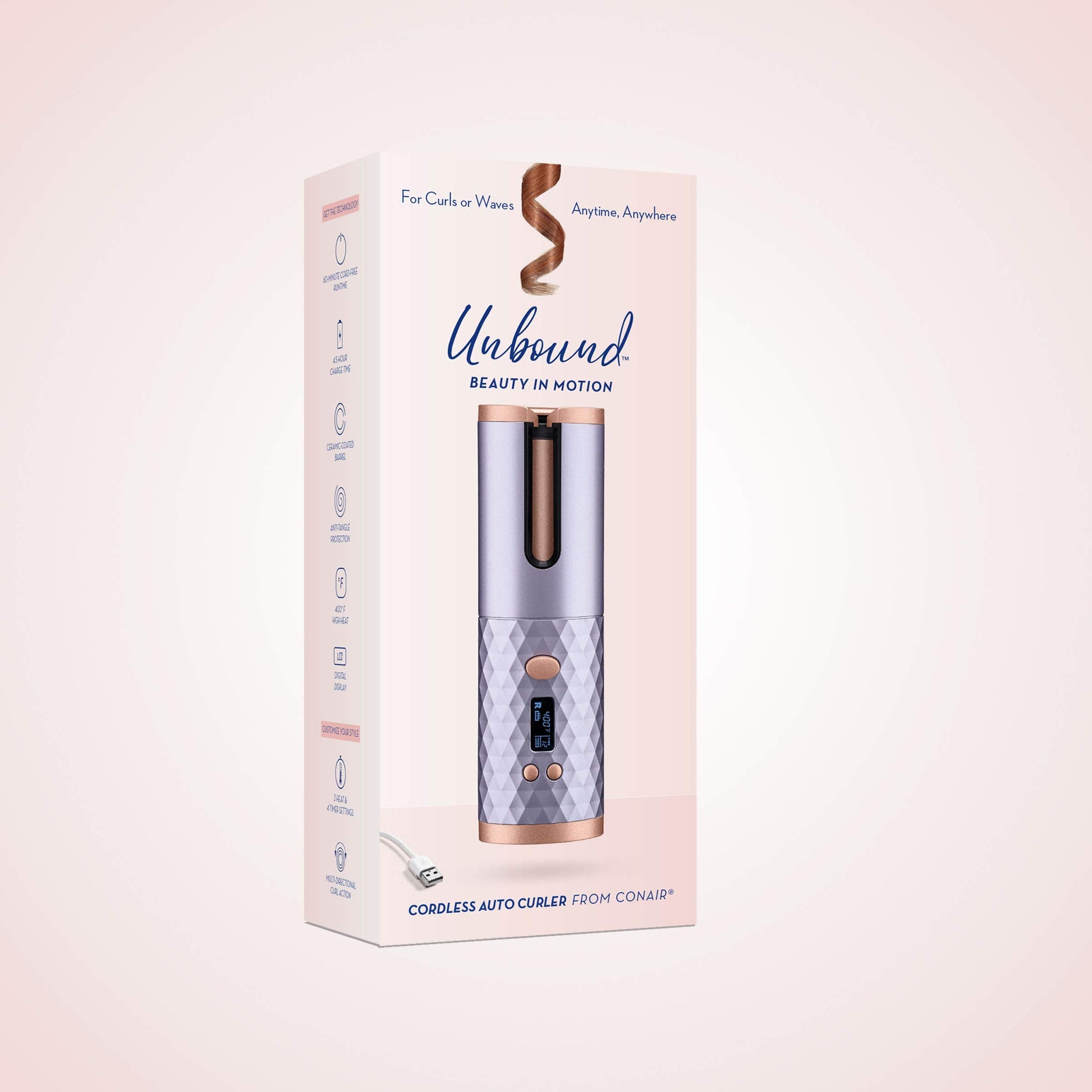 Details: New from Conair, Unbound Cordless Auto Curler. This revolutionary technology allows you to curl and wave your hair anytime, anywhere. The Unbound cordless -rechargeable auto curler features rechargeable lithium ion batteries and a removable USB charging cable to charge. Once charged, the Unbound Cordless Auto Curler can be used cord-free for up to 60-minutes. Run time will vary based on hair type and heat and timer settings selected. Charge fully overnight before first use. Charge time will vary depending on adapter and power source. Create beautiful curls and waves with the multi-directional curl chamber (left, right, or mixed) that reaches 400°F for professional curl results. The 3 heat and 4 timer settings allow you to select the desired temperature and the time setting to create tight to loose curls and waves. Unbound Cordless Auto Curler from Conair is easy to use and requires no skill makes for perfect replacement for your traditional curling iron or curling Wand without the cord. Perfect for travel and on-the-go styling and easily fits in your handbag or gym bag for Beauty in Motion. Includes USB charger and 2 lithium ion batteries. Individual airline restrictions may apply. Check with your carrier. U.S. Patents 8, 651, 118; 9, 629, 434; 9, 788, 625; and 10, 238, 196, and other pending/granted U.S. And International patents.