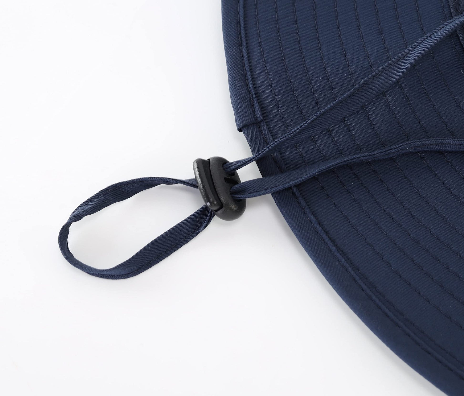 - Adjustable chin strap holds hat in place, elastic drawcord with toggle at back for adjustability