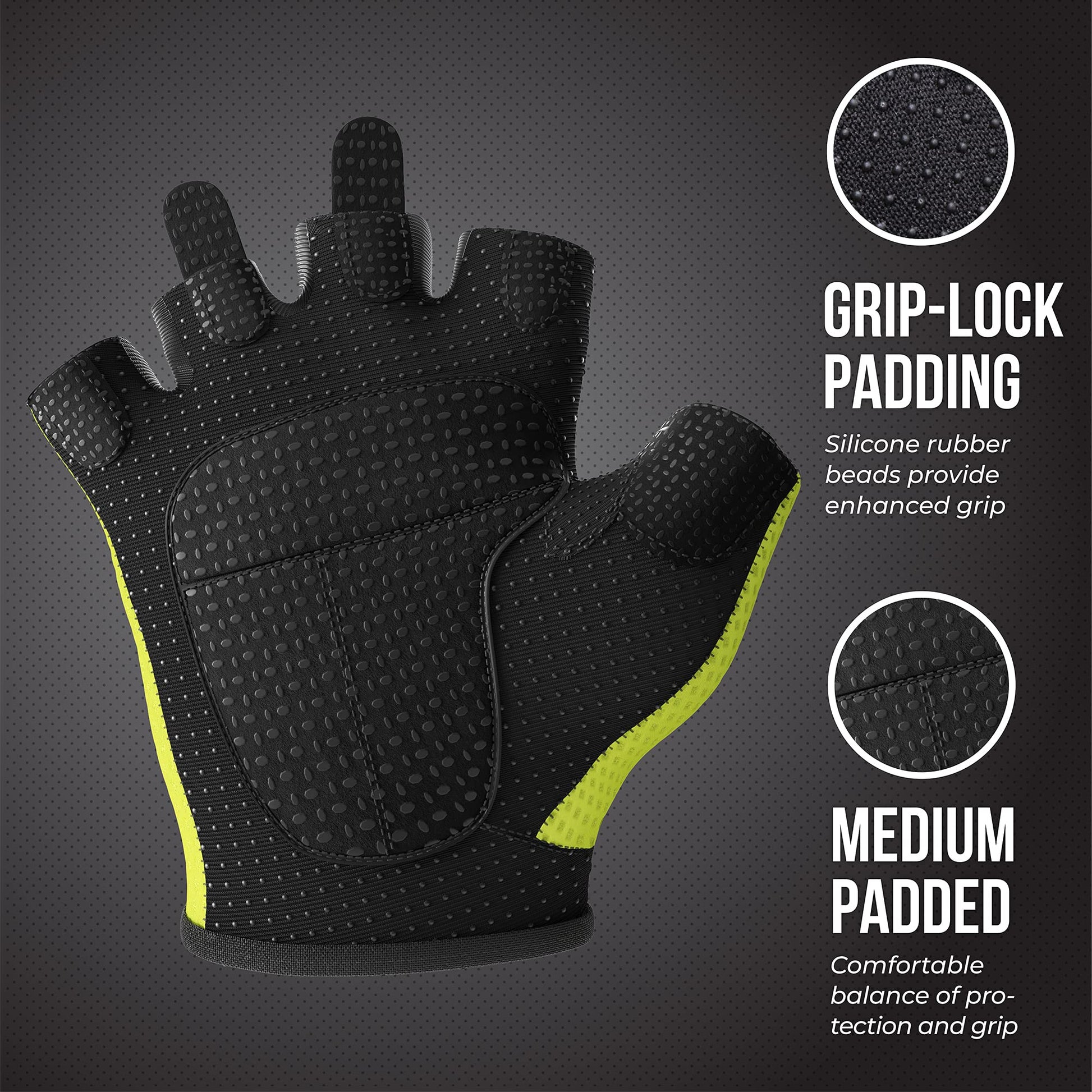 - š MEDIUM PADDED - GRIPLOCK PADDING - These gloves feature a comfortable medium foam padded palm which provides a balanced amount of protection and grip. Silicone rubber on the palm provides a grippy surface far superior to traditional leather.