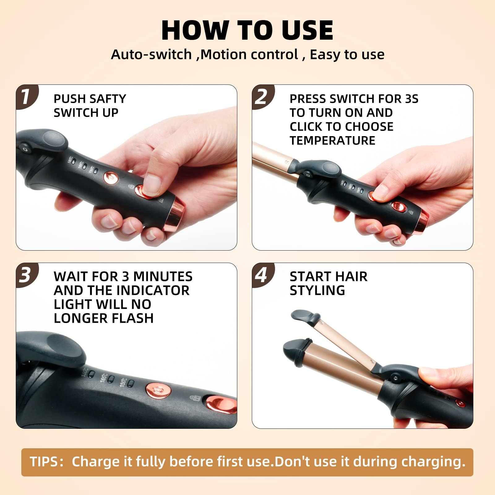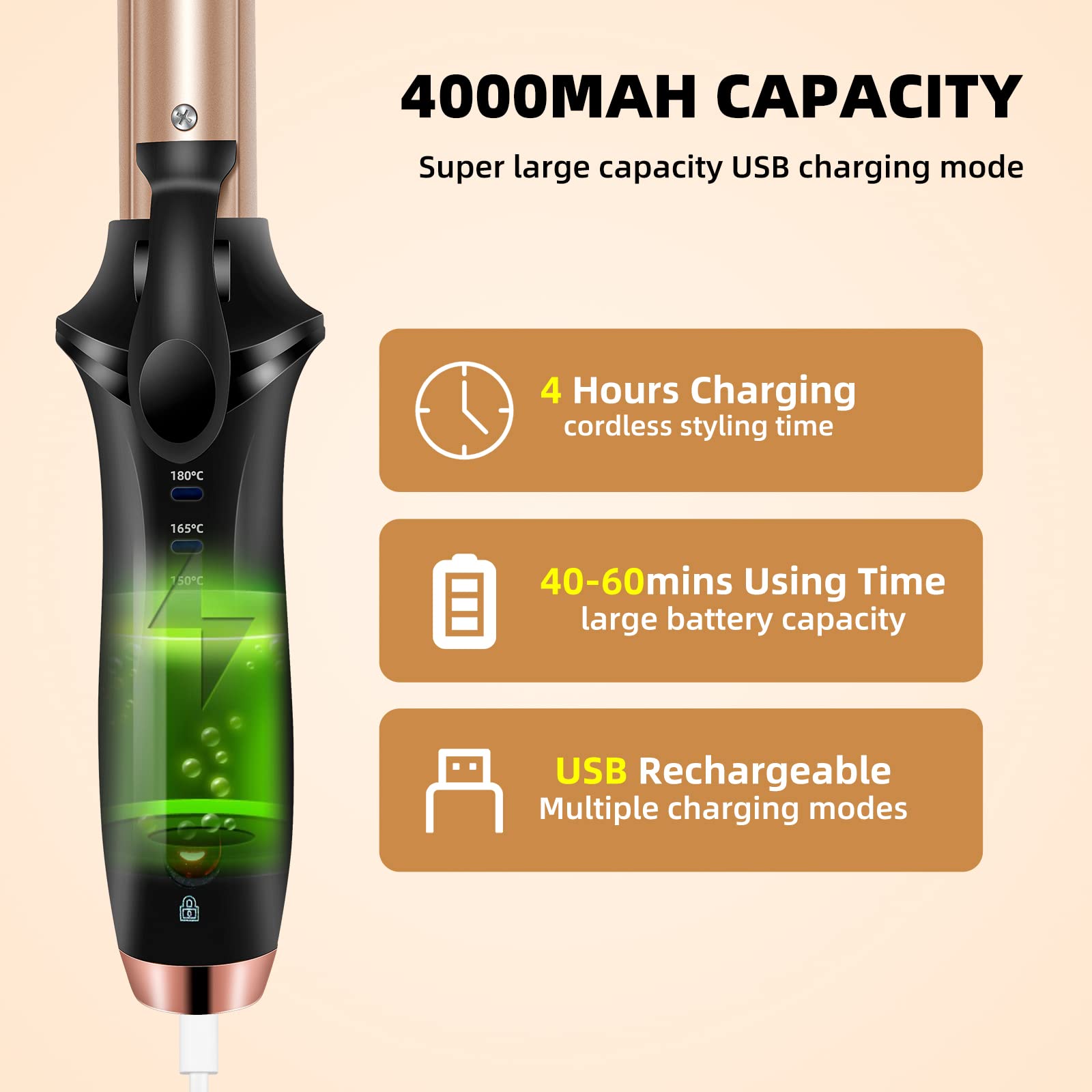 - Cordless Curling Iron Rechargeable: The cordless curling iron rechargeable with 4000mAh battery can be used for 40+ mins after fully charged. You can charge it via car and phone charger etc. After setting temperature, the indicator light stops flashing meaning you can use it. PLEASE NOTE:1. The battery operated hair curler can't be used while charging. 2. Please keep hair curler wand fully charged before use.