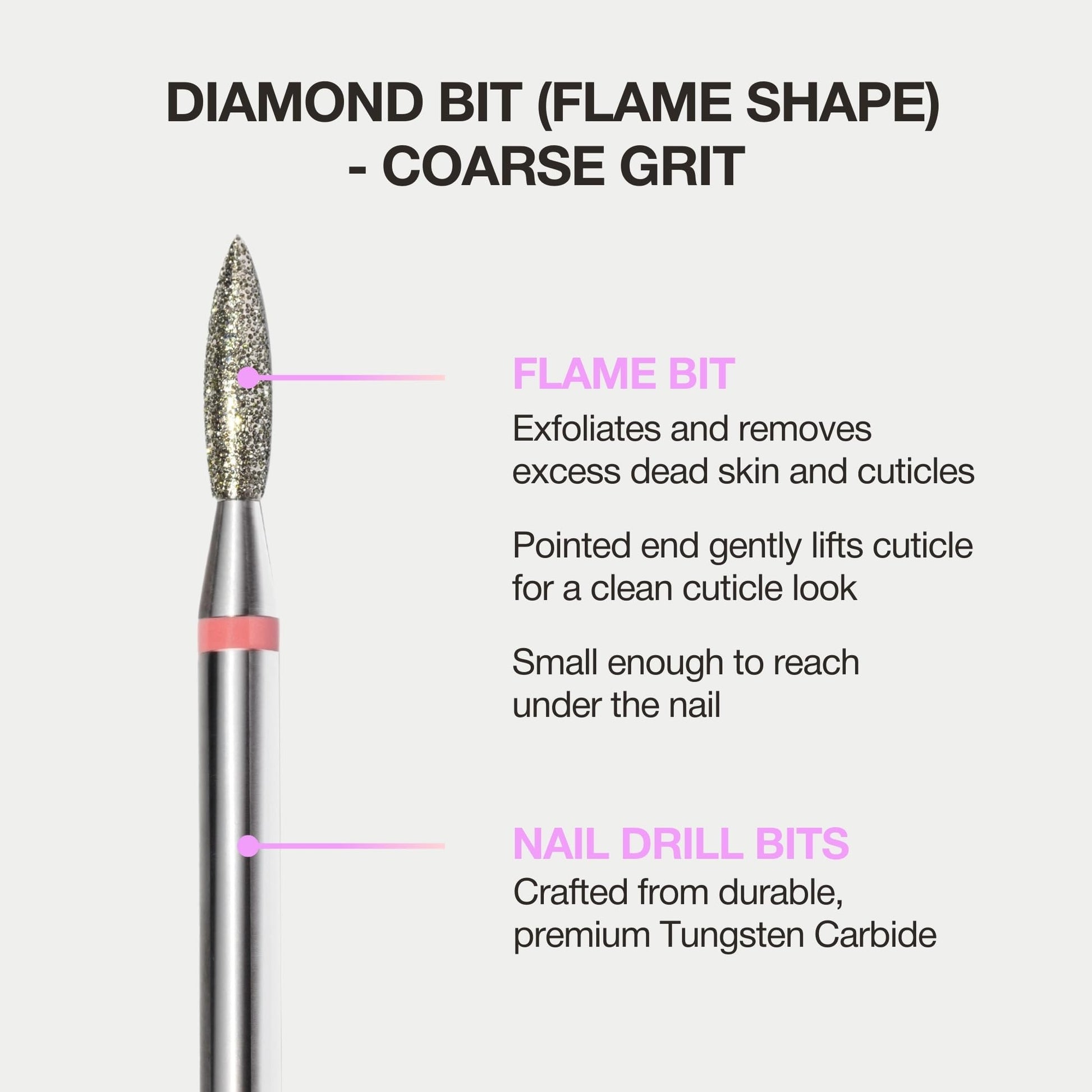 - PREMIUM QUALITY: Curacoro Cuticle Nail Drill Bit is designed to gently yet efficiently remove cuticles and dead skin, leaving your nails looking polished and professionally groomed. Achieve smooth, well-maintained nails without damaging the surrounding skin. Flame Shaped | Diamond Bit | Grit: Coarse | Shank Size: 2.1mm