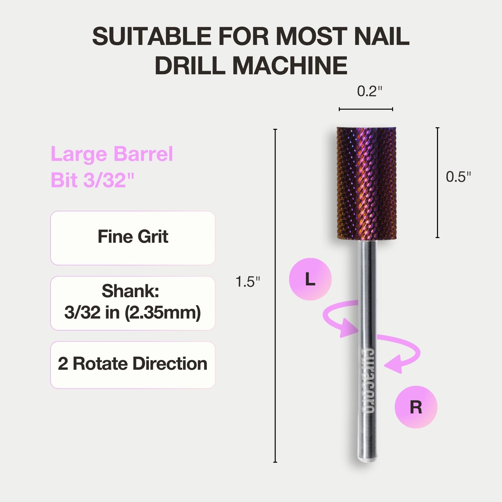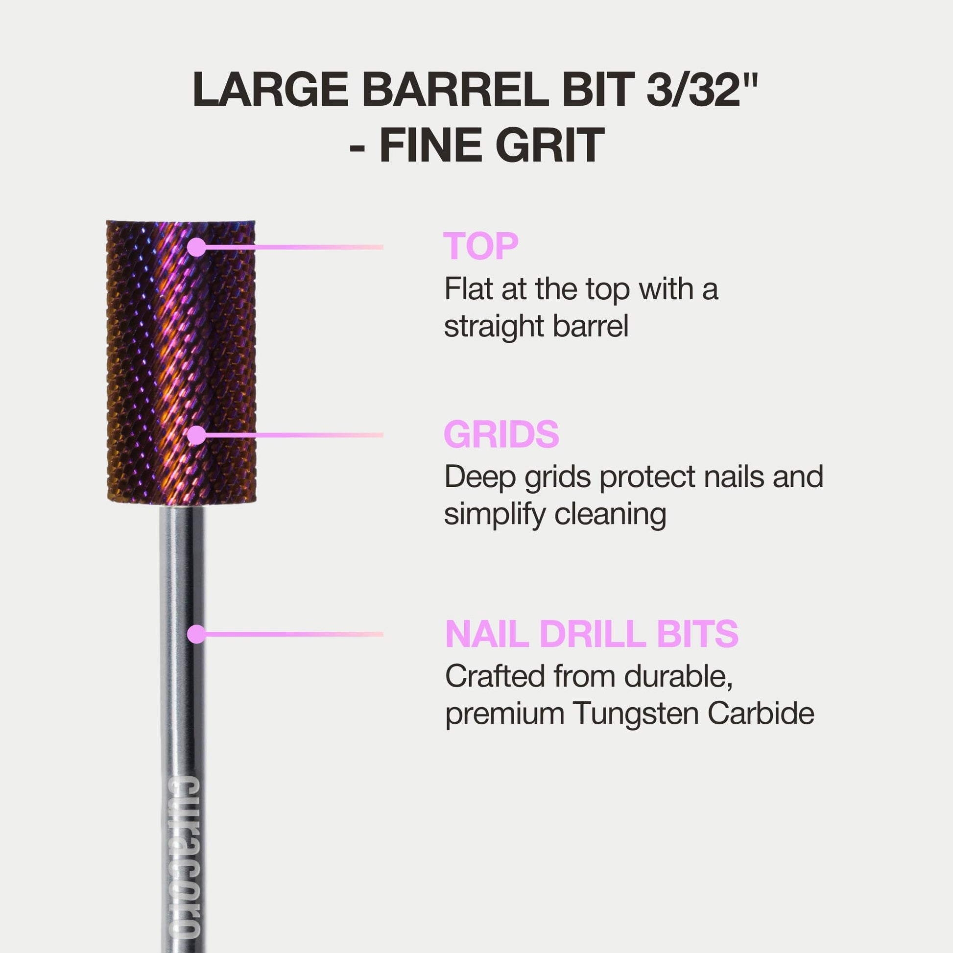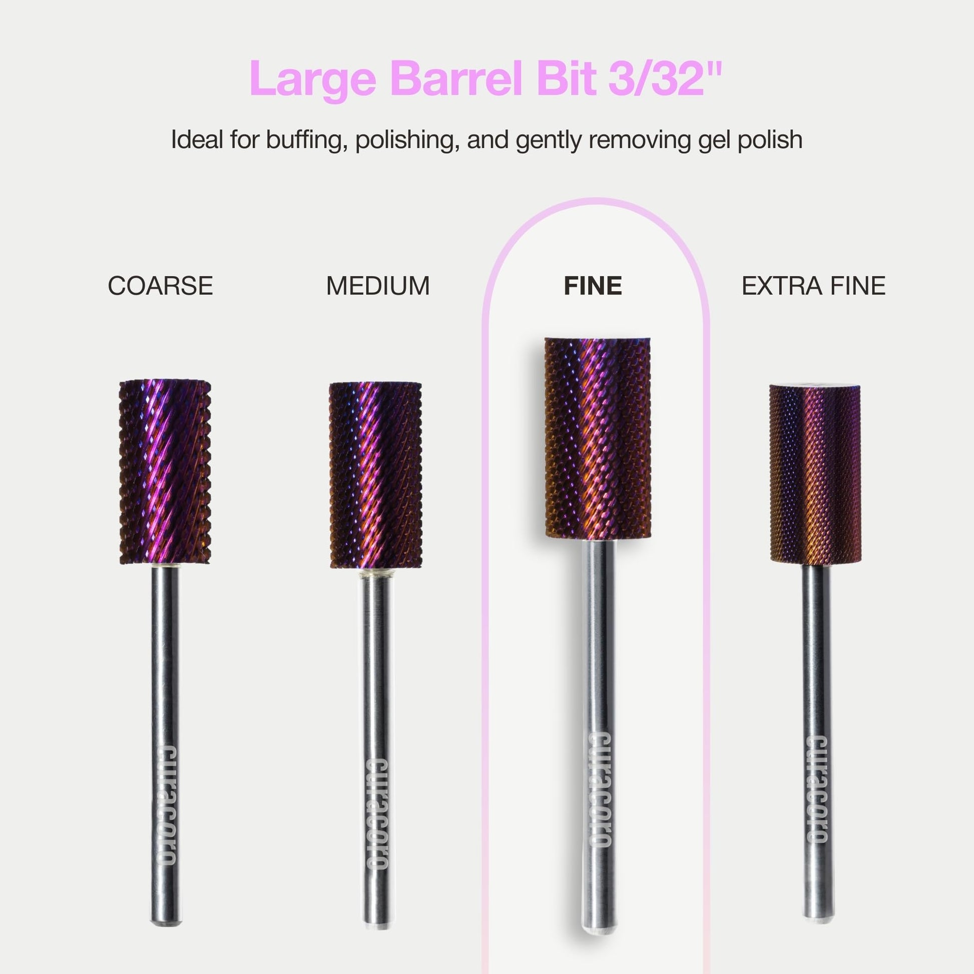 - PREMIUM QUALITY: These Curacoro nail bits are expertly crafted for buffing, polishing, and removing gel polish to ensure a shiny finish with precision and ease. Large Barrel | Smooth Top Carbide Nail Drill Bits | Grit: Fine | Shank Size: 3/32''