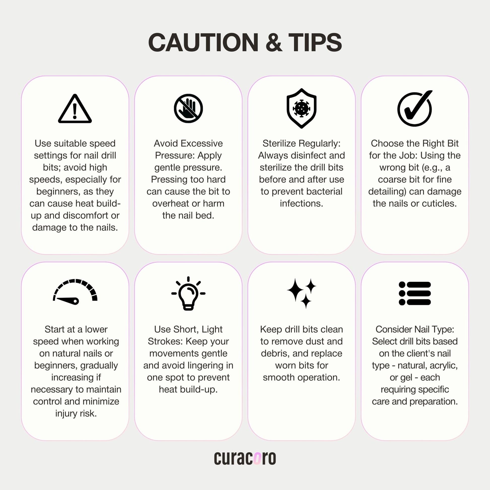 - SALON-GRADE TOOLS: Curacoro is dedicated to redefining nail care with high-quality, salon-grade nail drill tips. Experience luxury and sophistication with a variety of shapes, sizes, and grits tailored for every manicure.