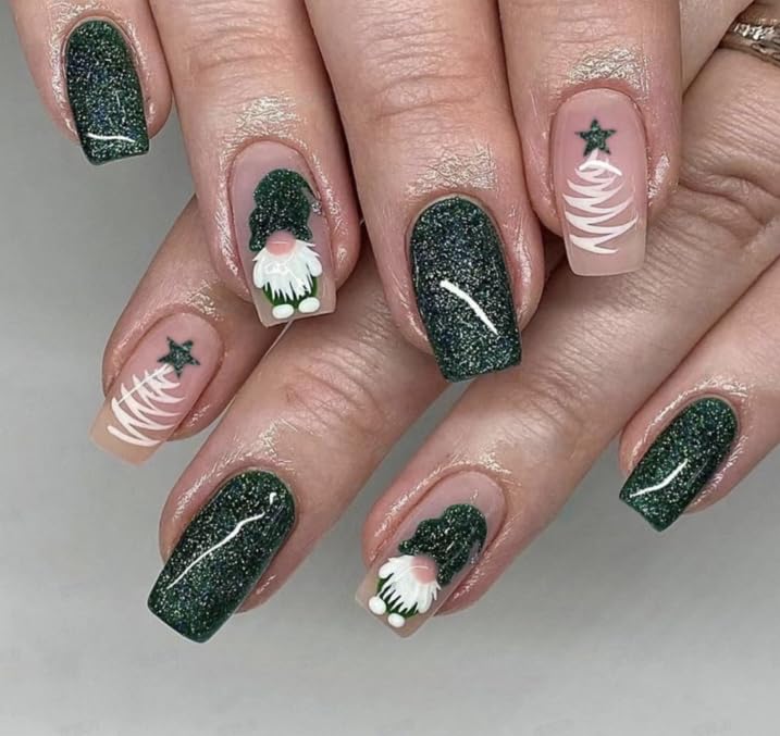 Curvlife Press on Nails Acrylic Fake Nails with Design Full Cover False Nails for Women Reusable Nail Kit with Nail Glue Adhesive Tabs Nail File (Green Christmas, 32pcs)