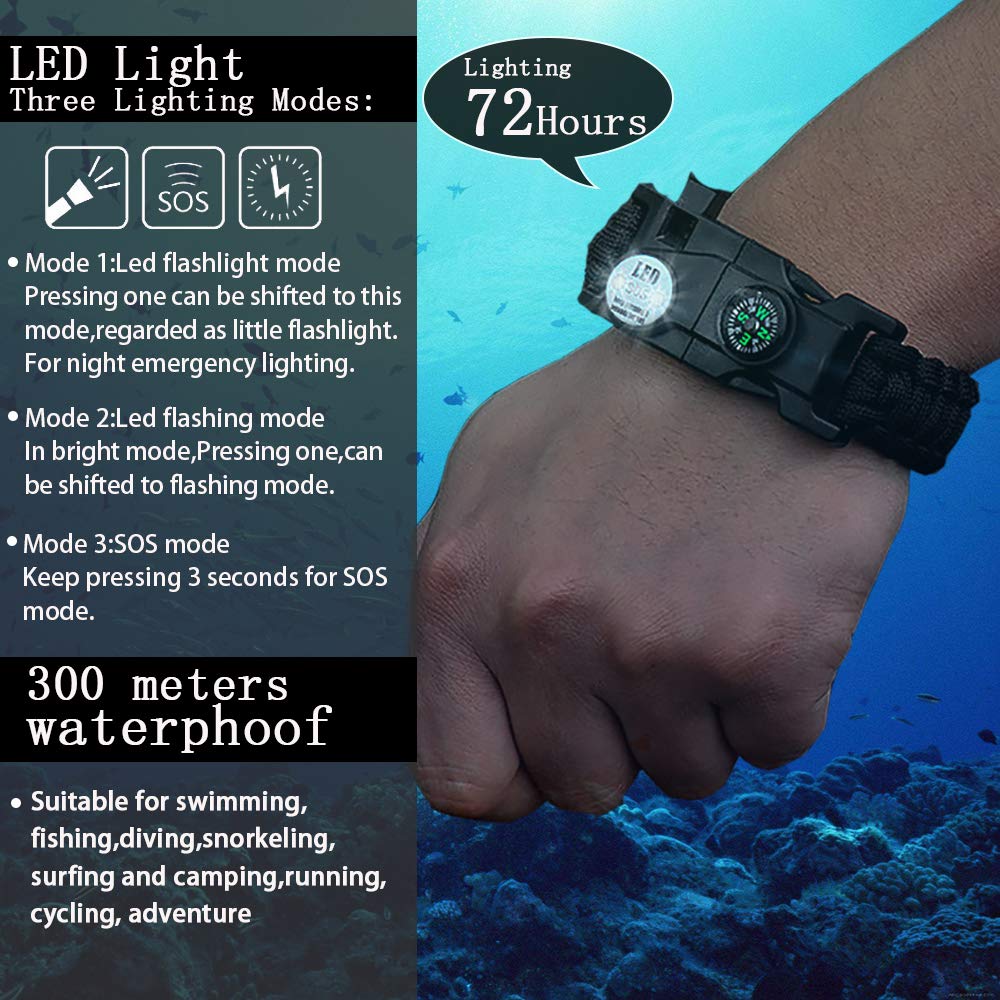 Details: Functional introduction:1.SOS LED light: Please press the 3 seconds SOS LED light when you need help. It can be turned on,When it is pressed again, it emits a high beam. This light can also be used for flashlight at night. The second time you press it is an explosion flash. When you press it for the third time, it will turn off. The SOS LED will make you more likely to be found at night and get help immediately. Note: The LED used in the disposable battery can supply power for 72 hours, please save your battery usage. Just use it in the dark to keep you safe.2. Compass: Place horizontally when using the compass, so that you can find the direction you want to go more accurately.(Tips:when you use the compass,first remove the metal objects below,because metal affects the magnetic field of the compass.)3. Big decibel whistle: can convey the sound within 500 meters, so that when you and your companions have a life-saving bracelet, if you are lost in the dark, you can whistle, so it is easier to find each other, in the dark Hearing the whistle can also make our heart easier to settle down.4. paracord rope: This rope can be unrolled to a diameter of 4 mm. The total length is 3-3.2 meters, and the 7 internal paracord ropes weigh 250 pounds and can be used in case of emergency.5. Multi-function tools: bike spoke wrench, bottle opener, can opener, hex wrench.