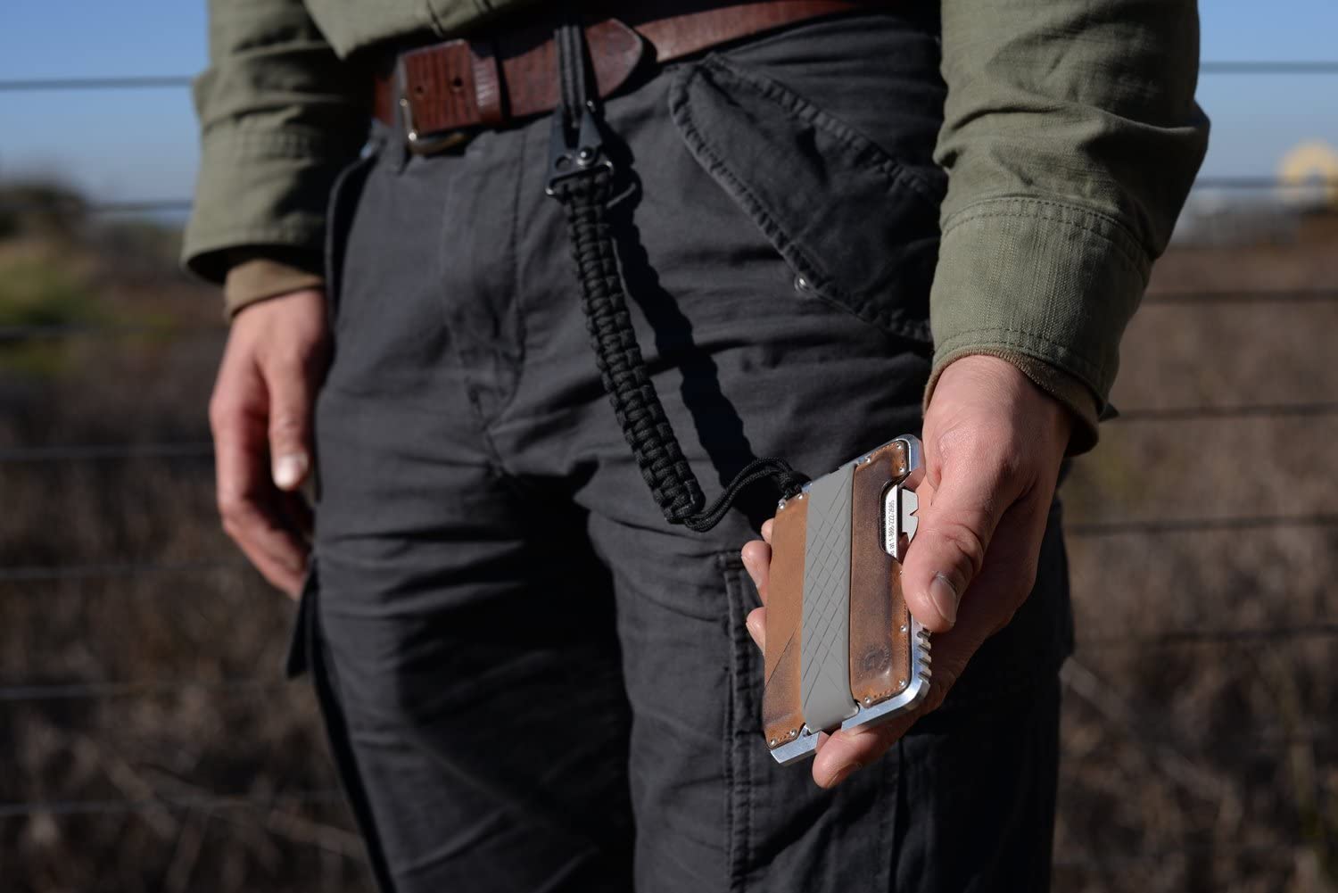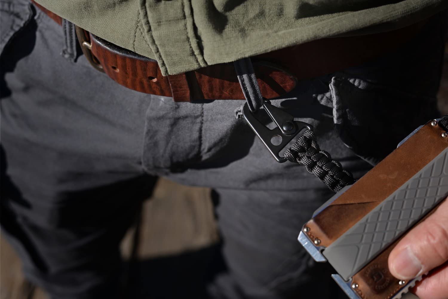 Details: Tether with cobra weave 550 paracord keeps your gear safe and sound. Tether Specifications: 6 inches woven and 10 feet long when unraveled Clip Specifications: Material: Steel Hardware Dimensions: 50mm x 32mm (2' x 1.25') Thickness: 7mm (0.25')