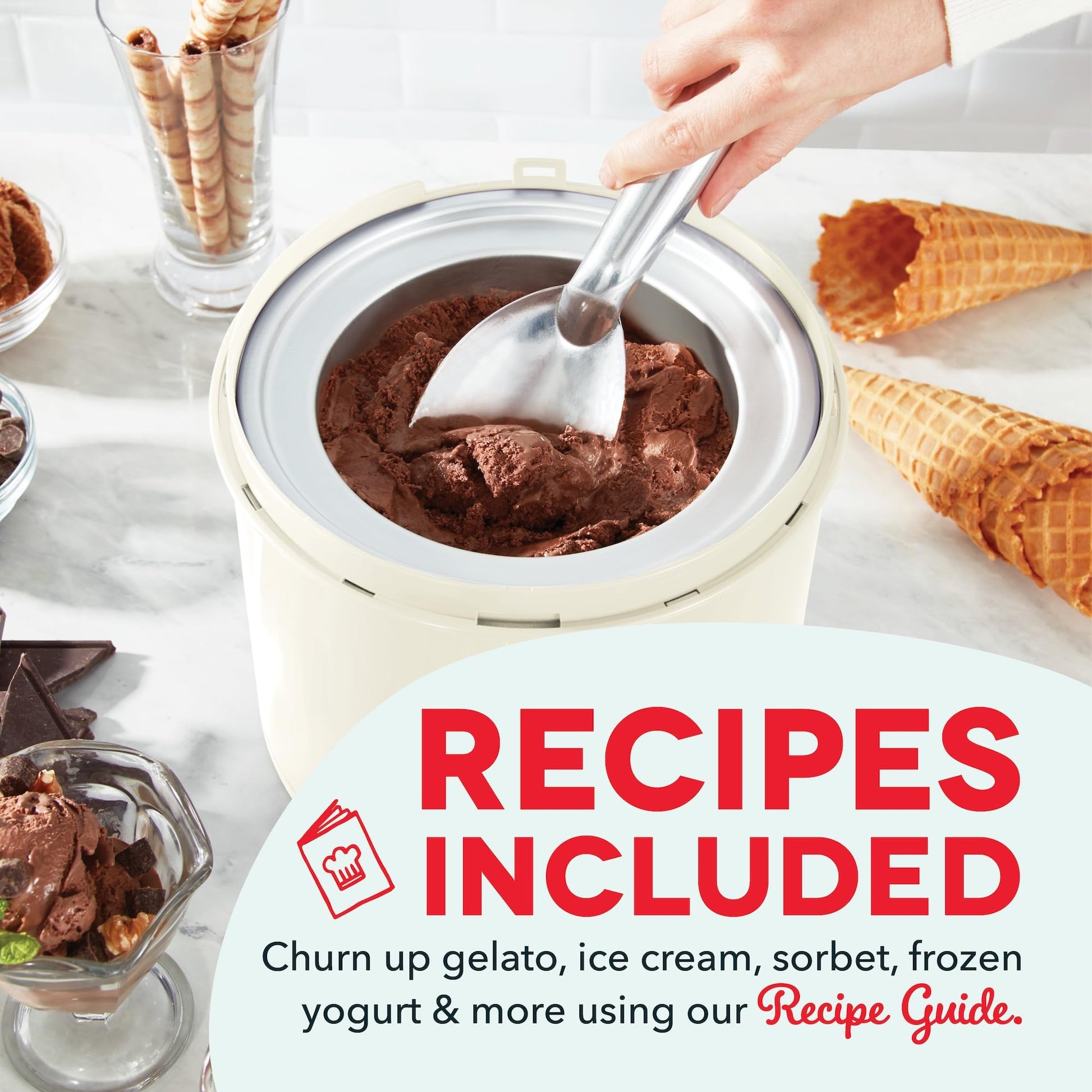 - Includes: Dash 2QT Ice Cream Maker and Recipe Guide